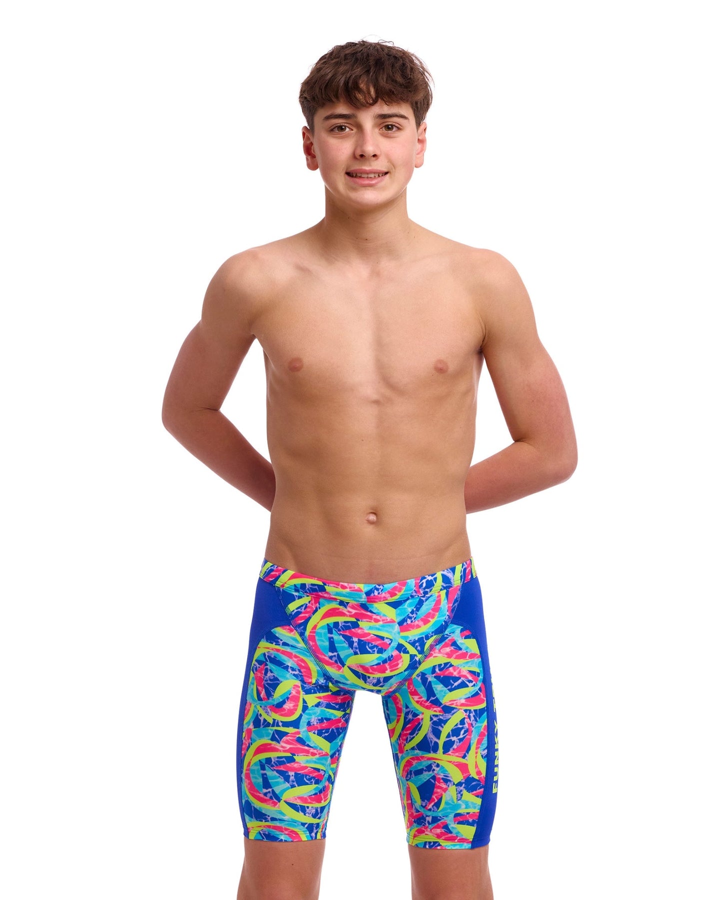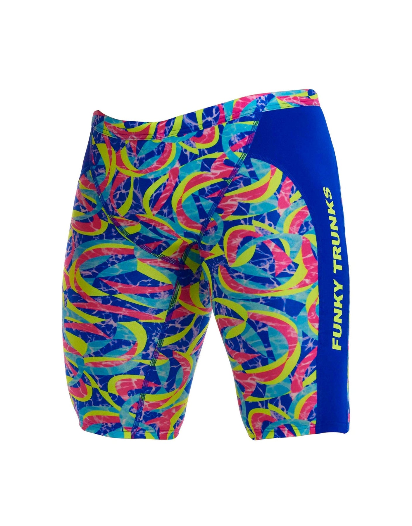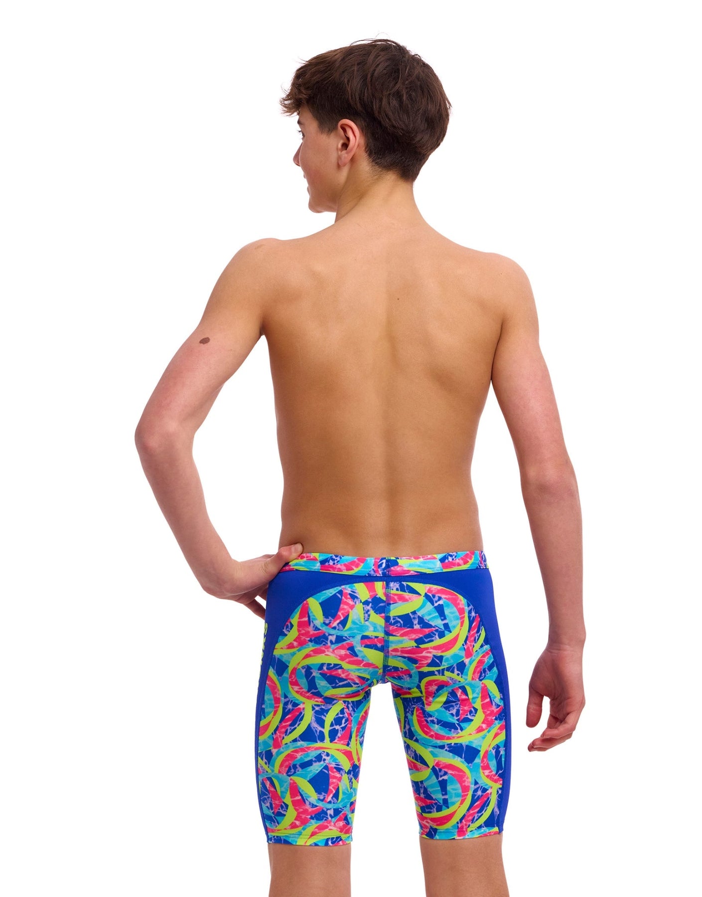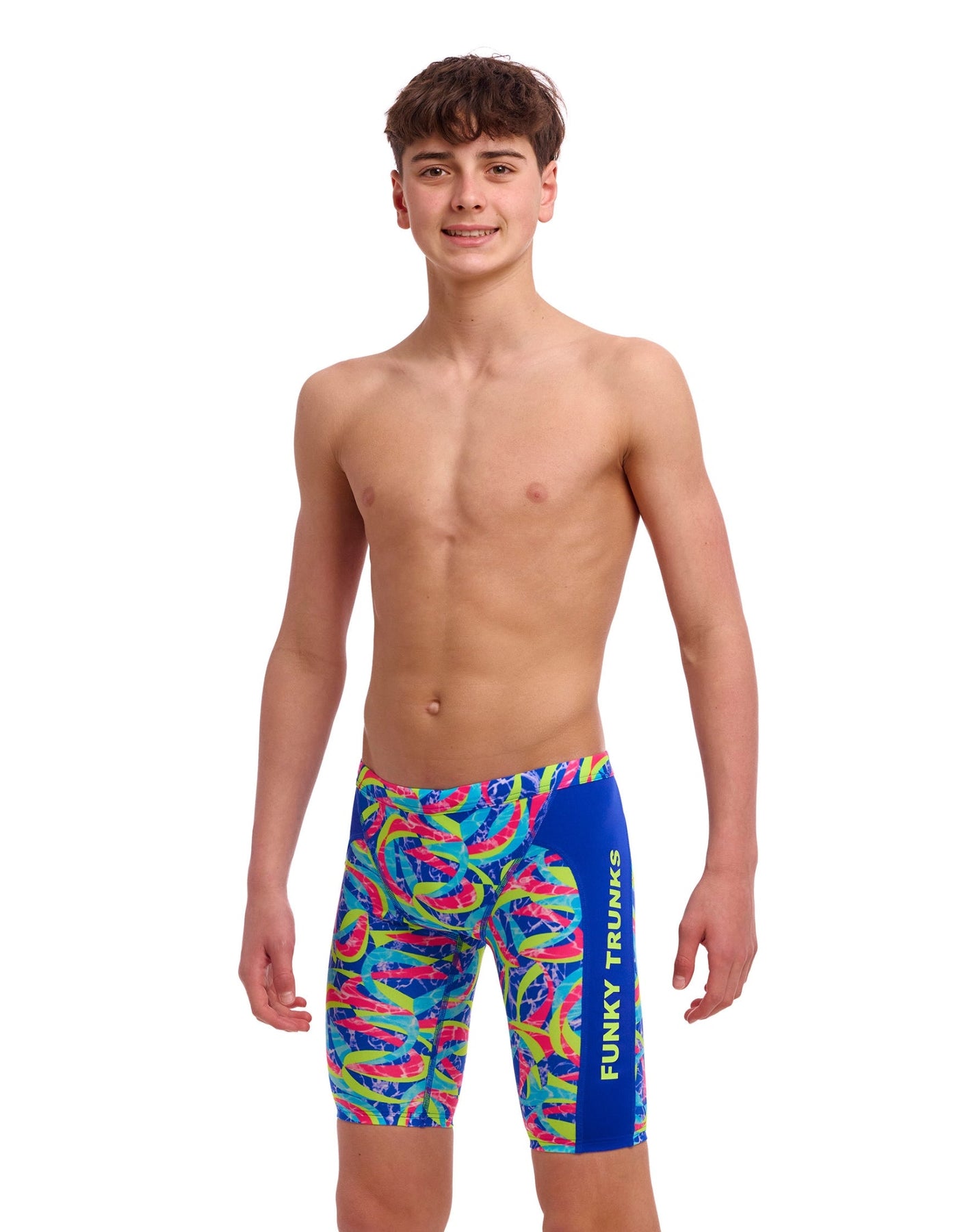 The Boys Choppy Waters Swim Training Jammer from Funky Trunks features multi-coloured prints and is the perfect swimwear for regular training and swimming. A drawcord, wide elastic leg opening, and waistband offer a comfortable and secure fit while swimming. The Jammers are made from Chlorine-resistant Eco C-Infinity fabric and are long-lasting.