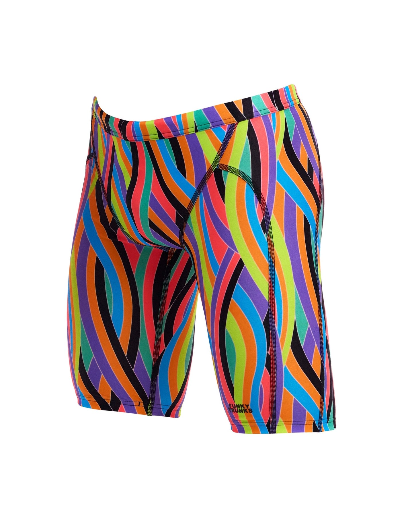 The Boys Curl Curl Swim Training Jammer from Funky Trunks is the perfect swimwear for recreational or performance-based swimming, featuring multi-coloured wavy prints. With a drawcord, wide elastic leg opening, and waistband, the jammers offer a comfortable and secure fit during your swim. They are made from Chlorine-resistant Eco C-Infinity fabric and are long-lasting.