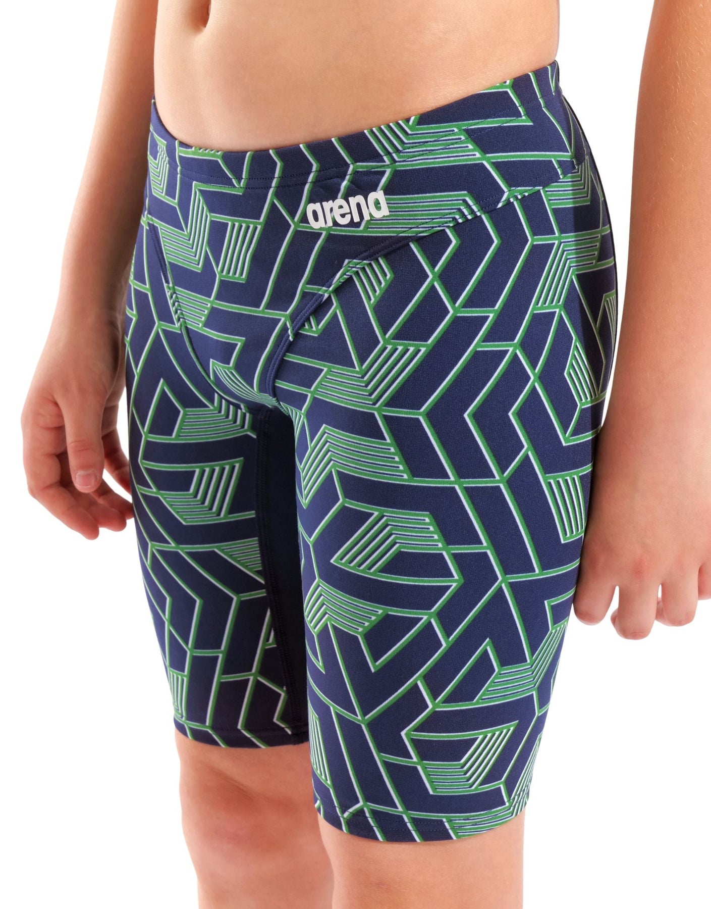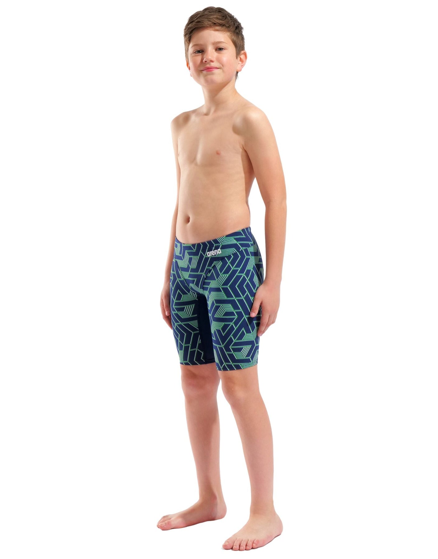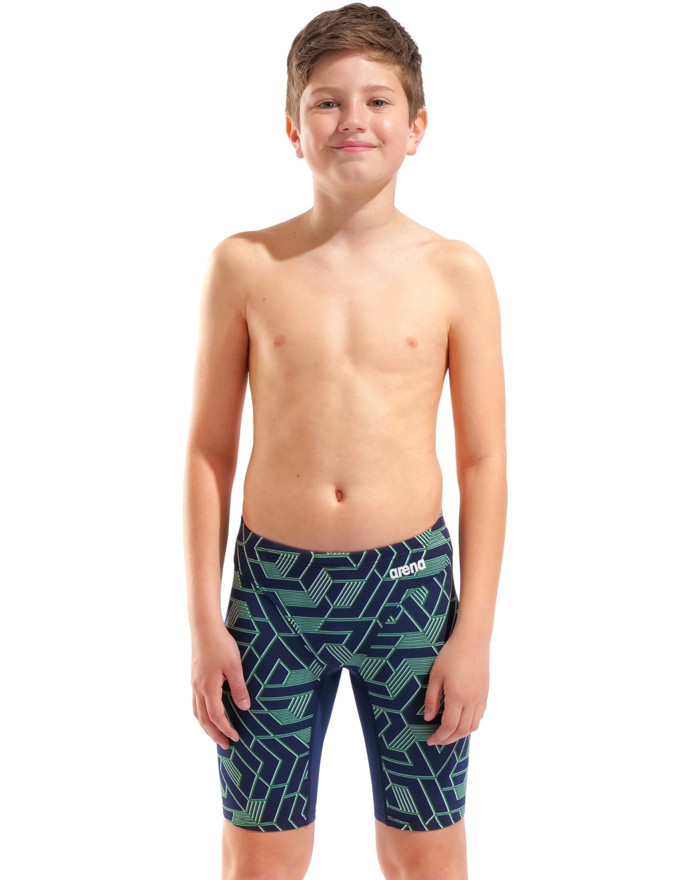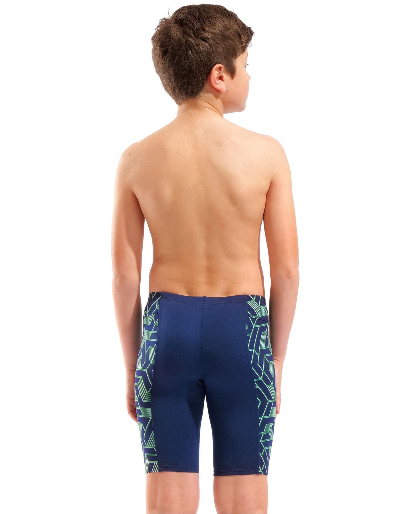 The Boys Escape Swim Jammer by Arena is designed with a striking geometric pattern at the front and sides of the jammer in blue and green. It includes an inner drawstring and front lining to ensure a secure fit and comfortable coverage while allowing unrestricted movement. Crafted from long-lasting MaxLife Eco fabric, it delivers exceptional chlorine resistance and UV protection, ideal for frequent swimmers.
