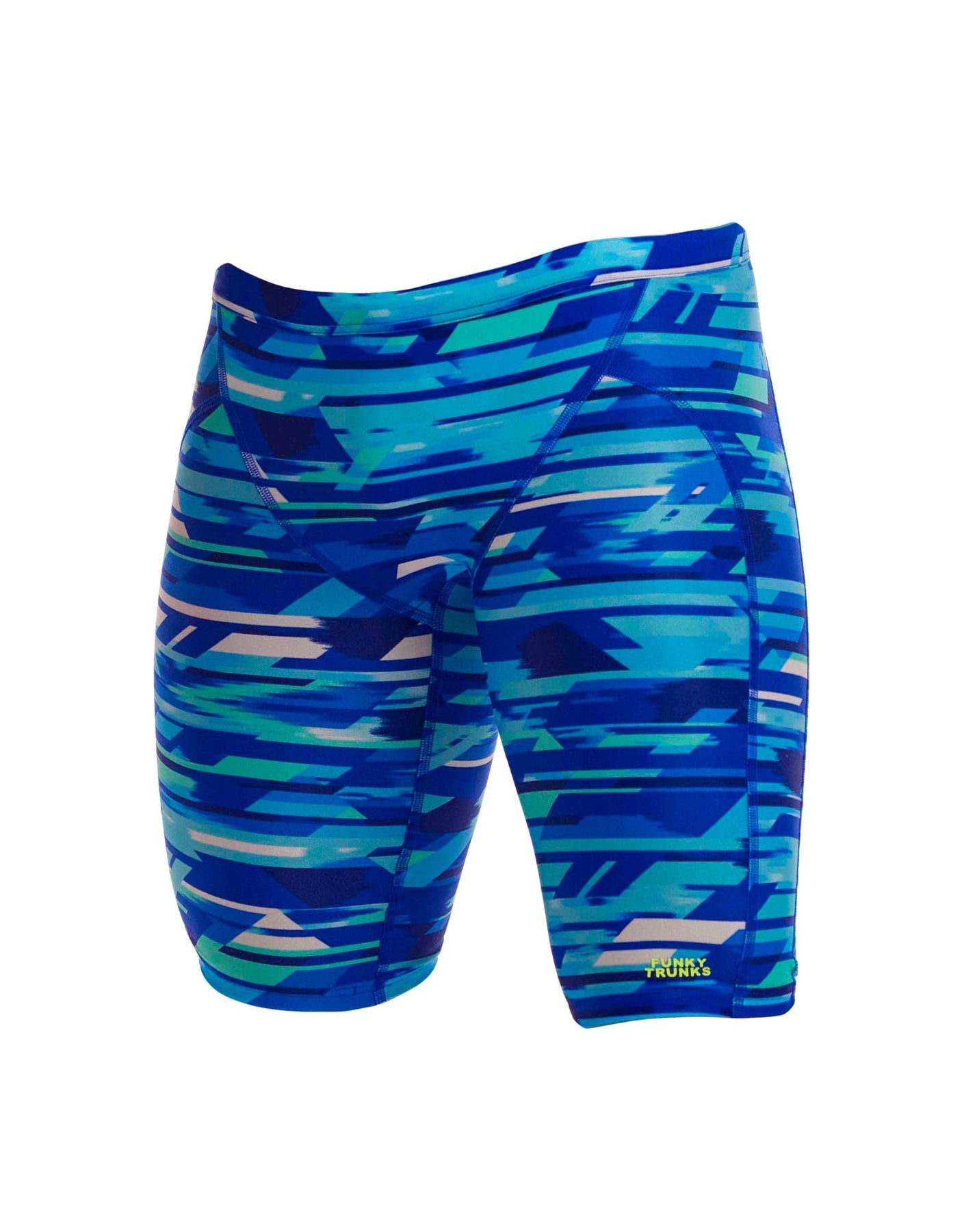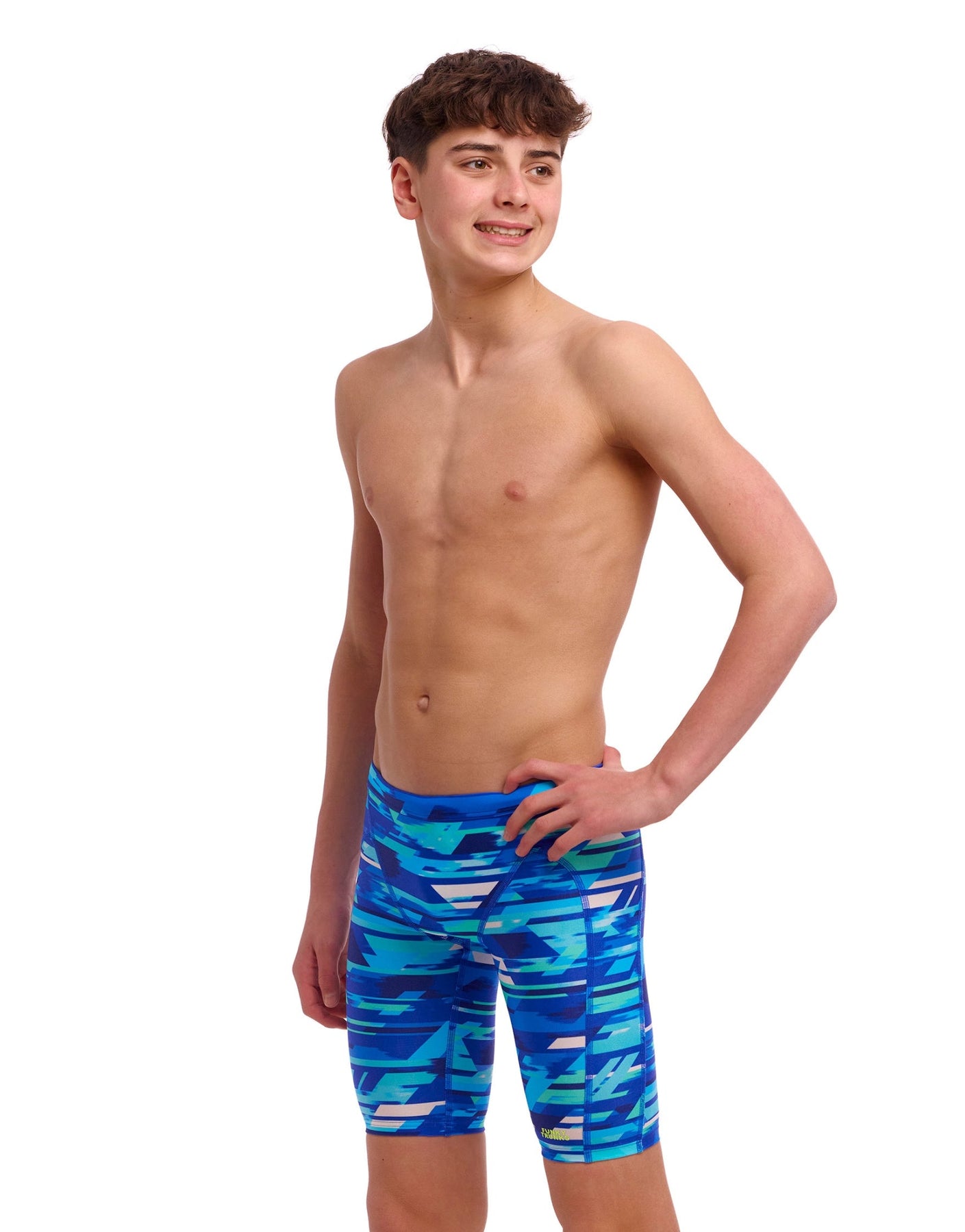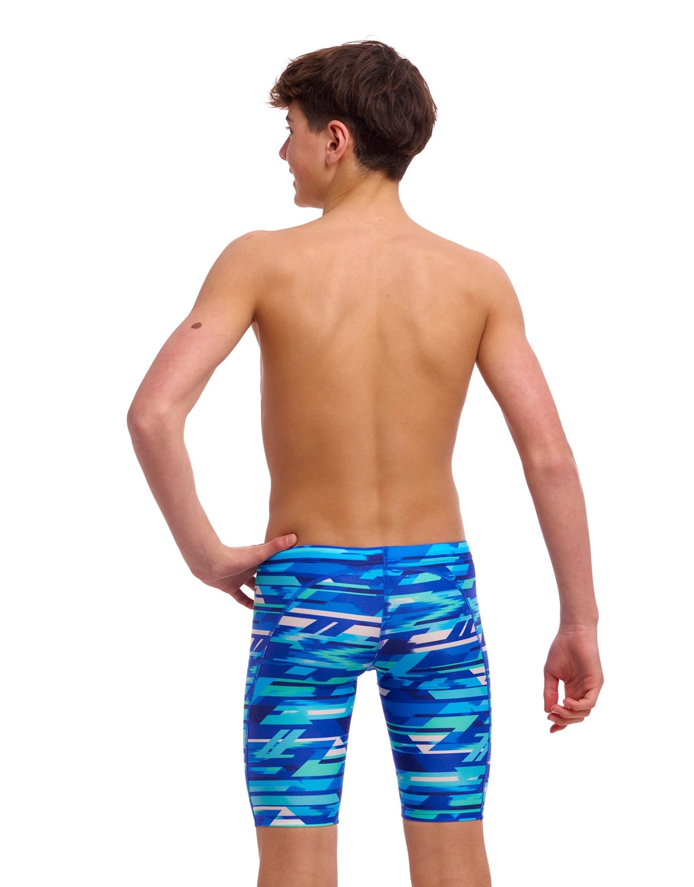 The Boys Pace Racer Swim Training Jammer from Funky Trunks is the perfect swimwear for regular training and swimming, designed with beautiful prints in blue and white. With a drawcord, wide elastic leg opening, and waistband, the jammers ensure a comfortable and secure fit while swimming. Made from eco-friendly ECO C-infinity fabric, it offers high chlorine resistance and great durability.