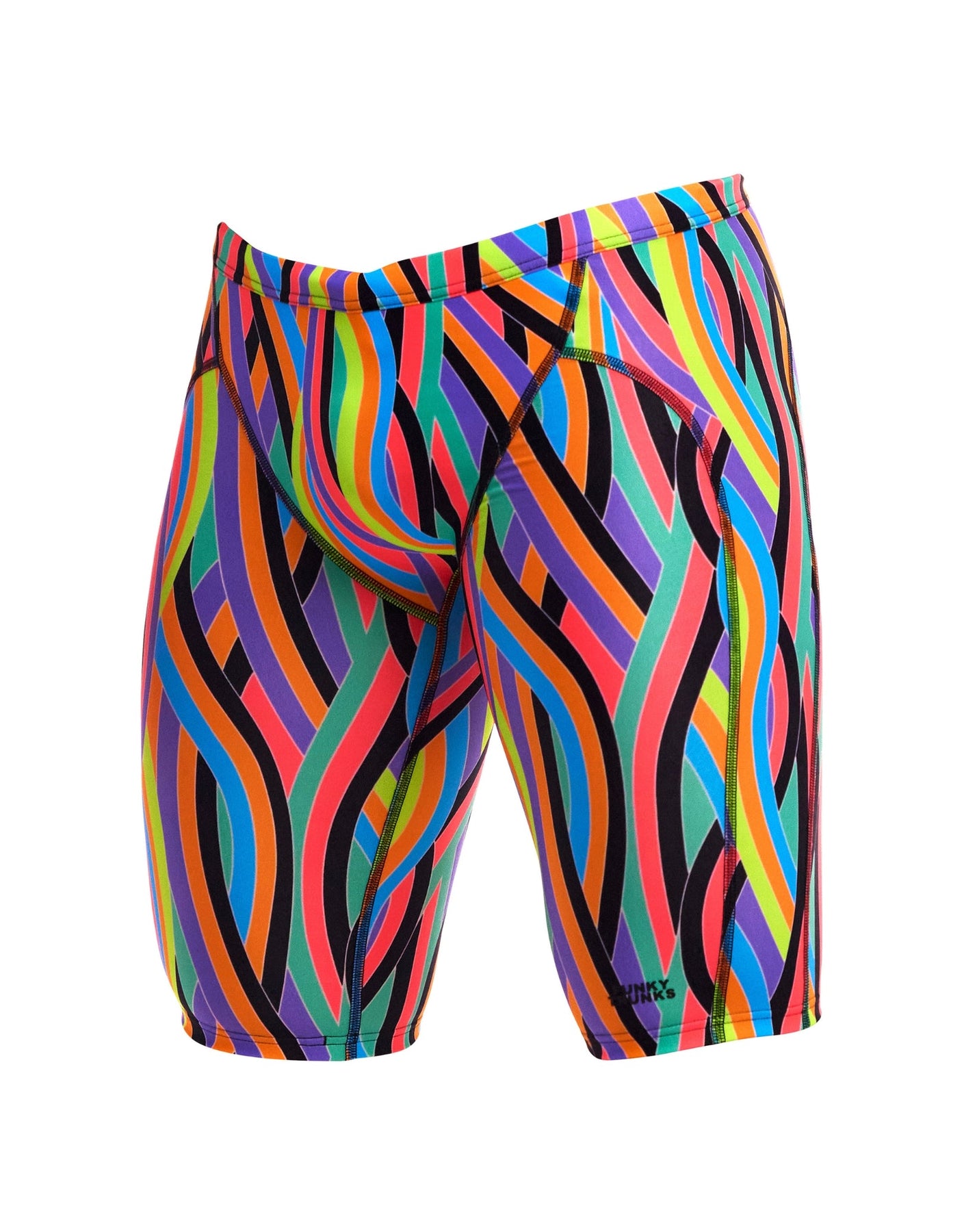 The Curl Curl Swim Training Jammer from Funky Trunks features multi-coloured wavy prints and is perfect for recreational or performance-based swimming. The wide elastic leg opening provides comfort, and the wide waistband with drawcord ensures a secure fit. Made from ECO C-Infinity fabric, the jammers offer high chlorine resistance and great durability.