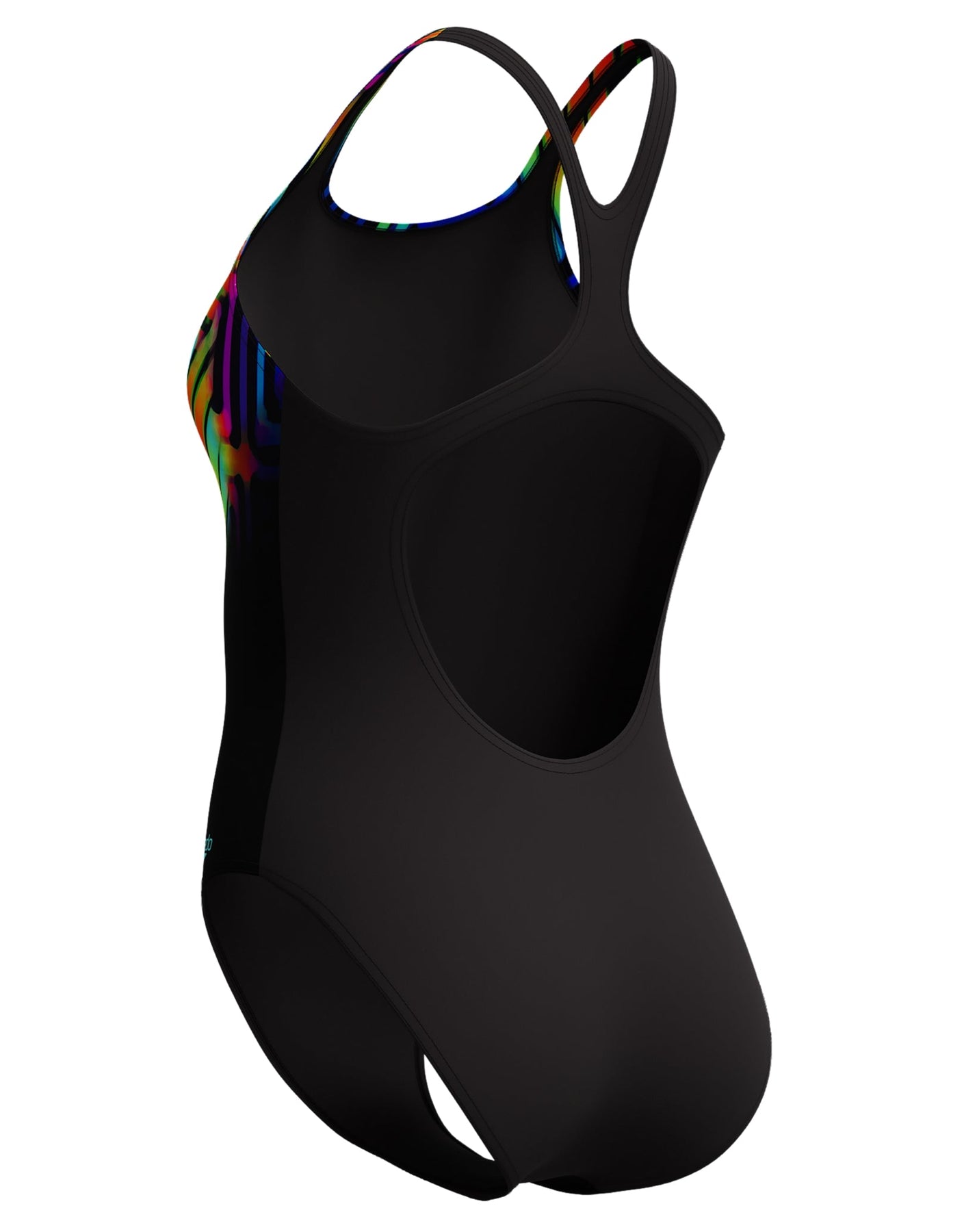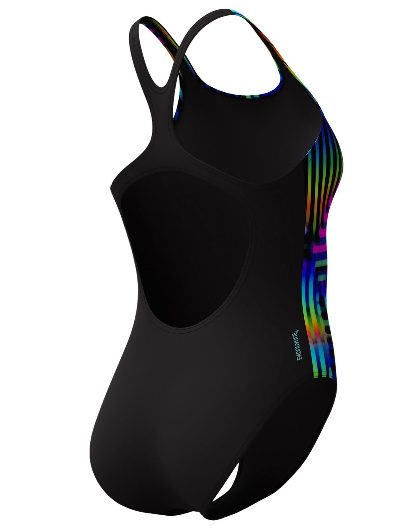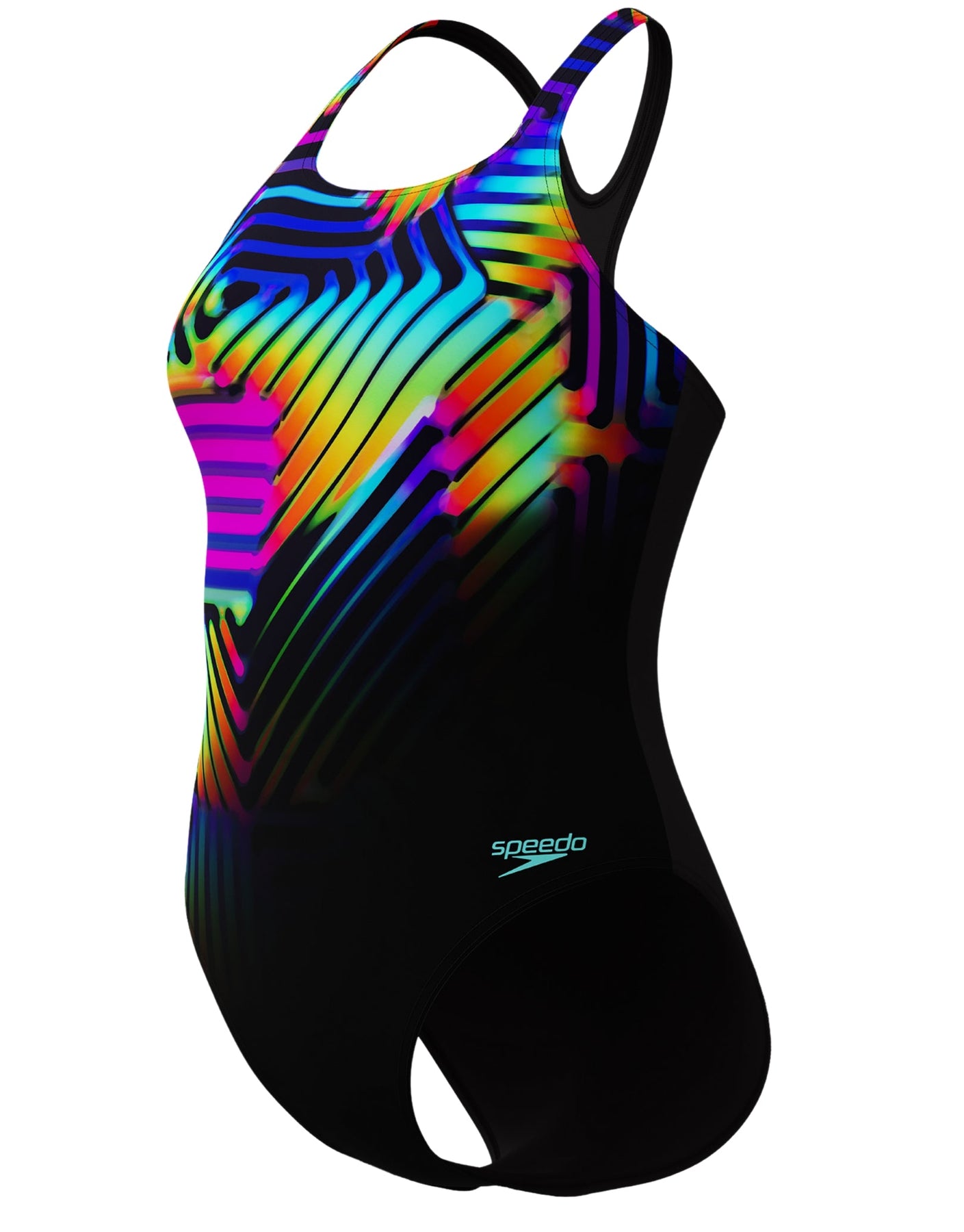 The Digital Placement Medalist Swimsuit from Speedo features a stunning digital print at the top of the swimsuit in blues, pinks and yellows on a chic background of black. The classic medalist swimsuit aids shoulder movement during swimming training, it has a supportive elastic underband and PBT liner to help minimise bust movement. Quick-drying Endurance+ Max fabric offers high chlorine resistance and durability, so you can swim-wash-repeat.