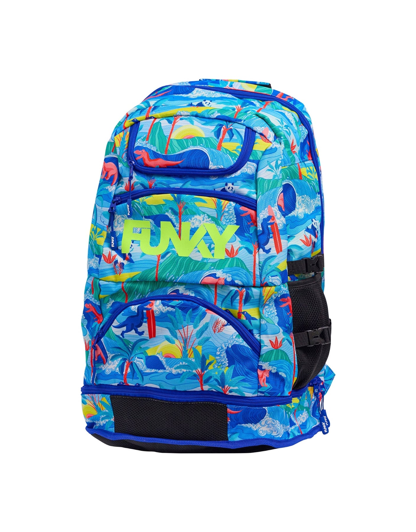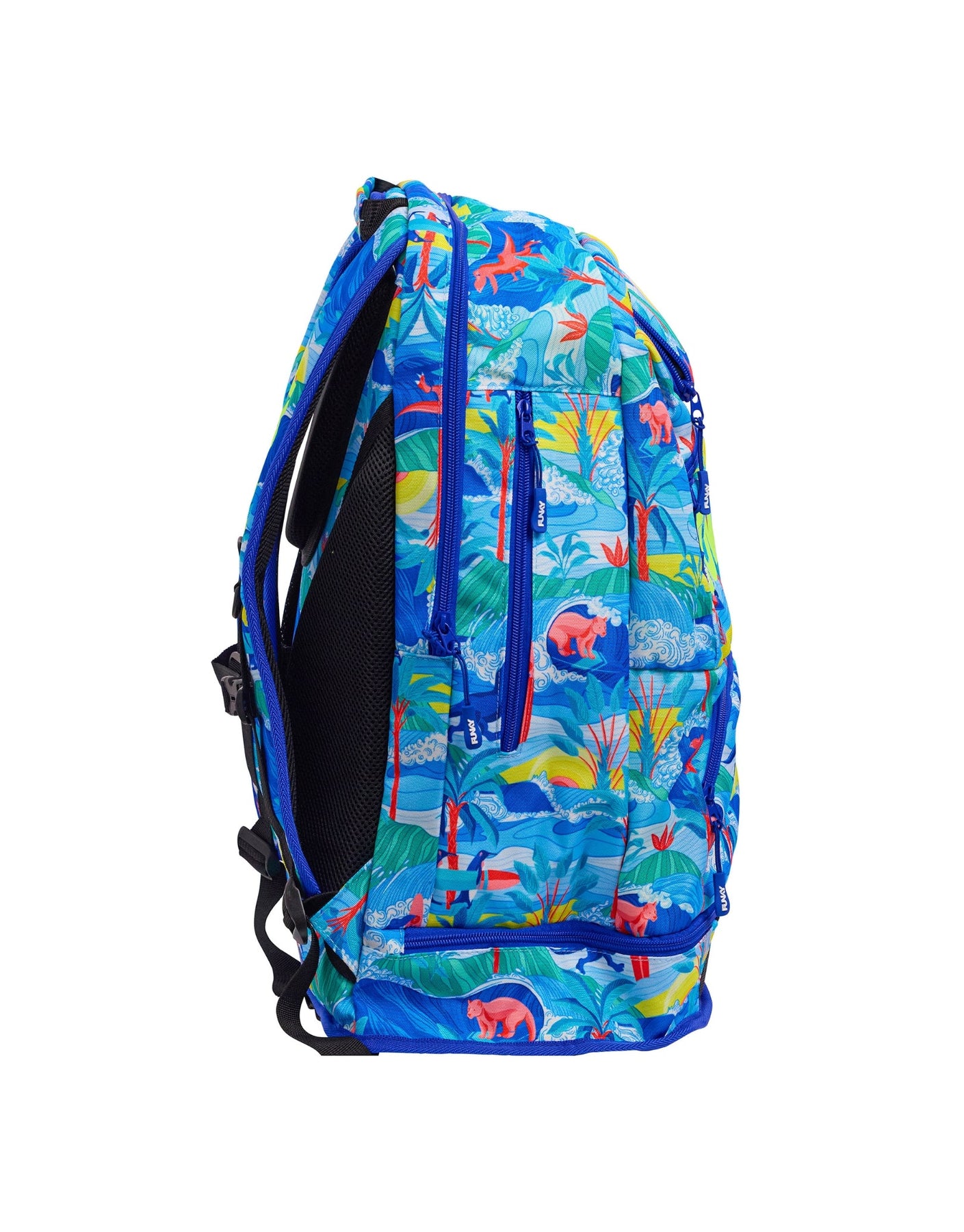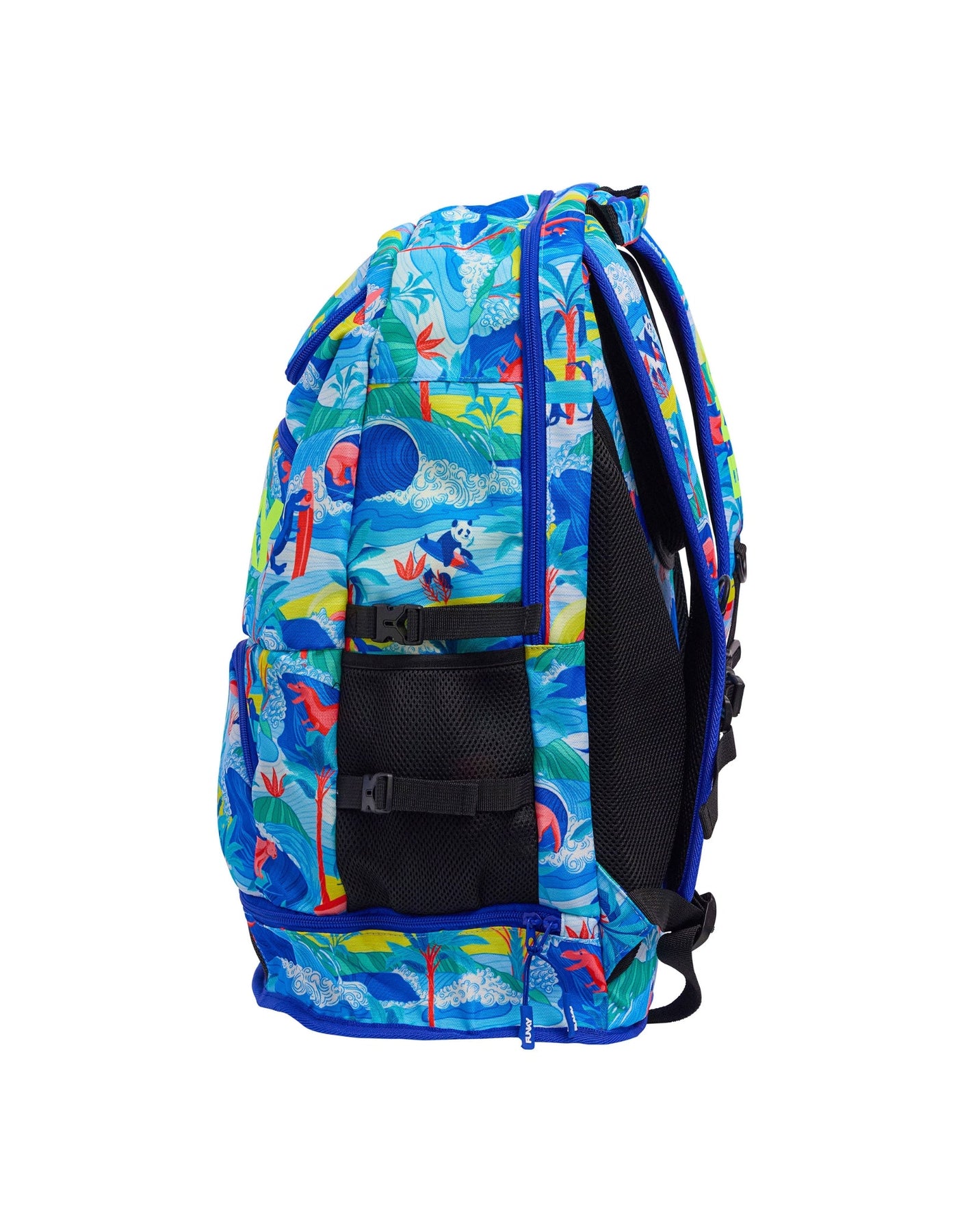 The Duuude Elite Squad Backpack from Funky Trunks is a stunning swimming bag with an all-over pattern of blue and fun animals. This is an essential piece of kit to keep all your swimming gear in one place, with multiple segments and padding for postural support. There is a fabric-lined goggle compartment, a waterproof base compartment, and a useful cooler bag zip to keep your drink and food cool.