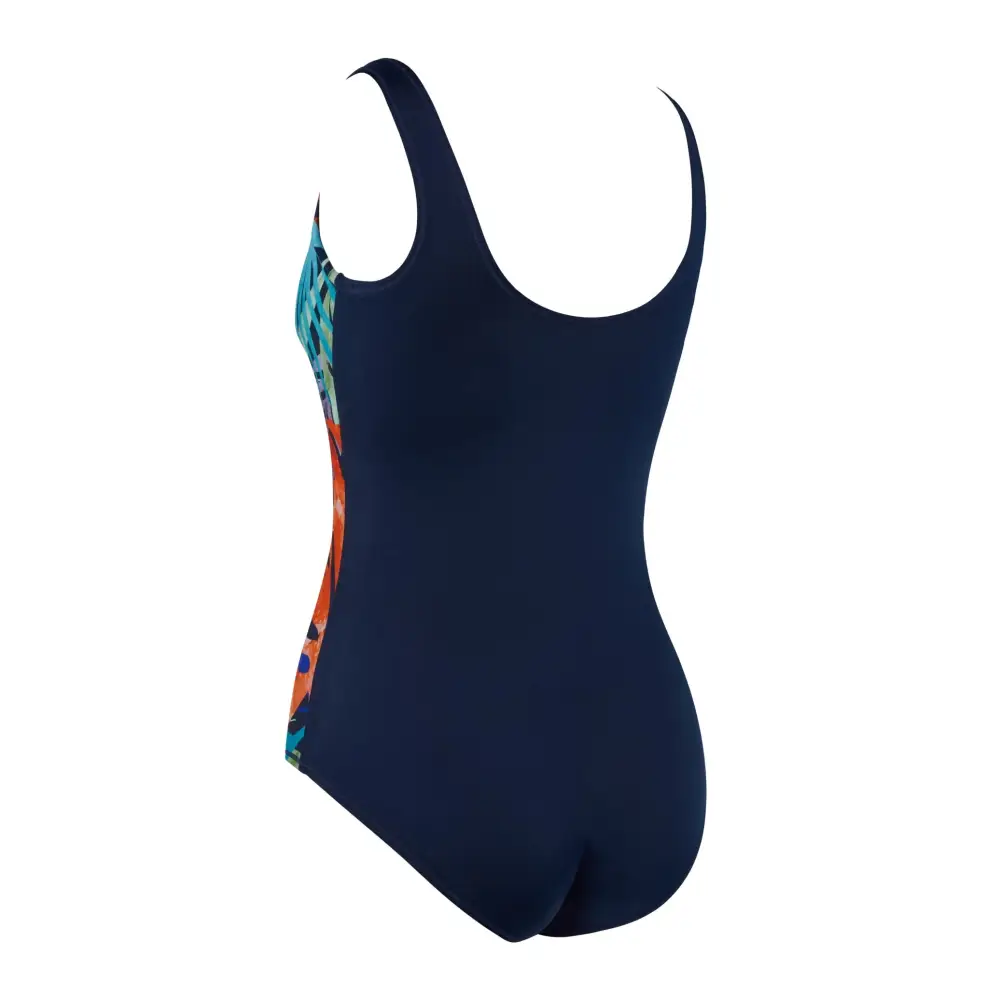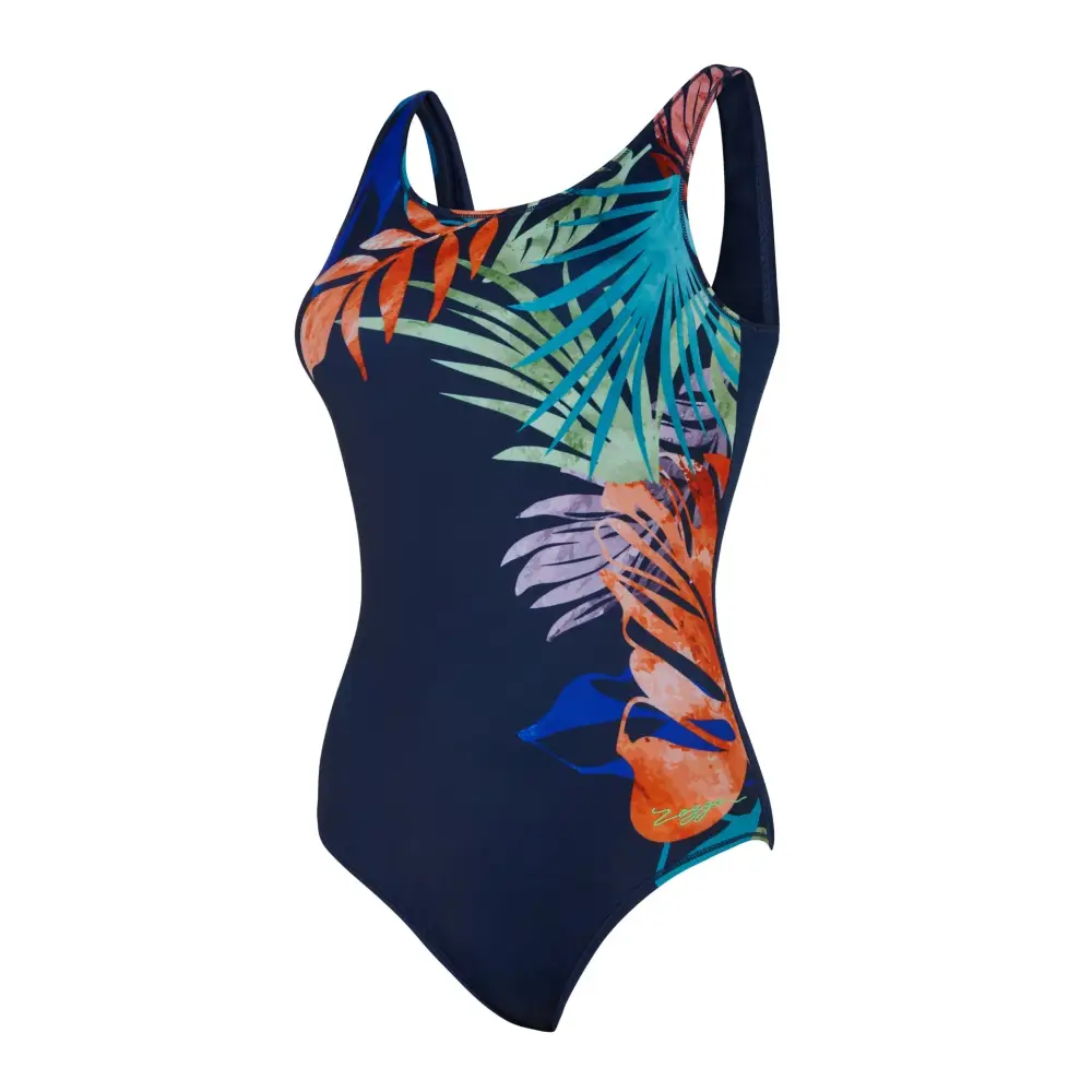 The Elegance Scoopback Swimsuit from Zoggs is a perfect piece for those looking for quality and comfort. The foam cups, front lining, and medium leg cut offer great comfort and support while swimming. With the stunning prints, the swimsuit is made from chlorine resistant Ecolast fabric and is long-lasting.