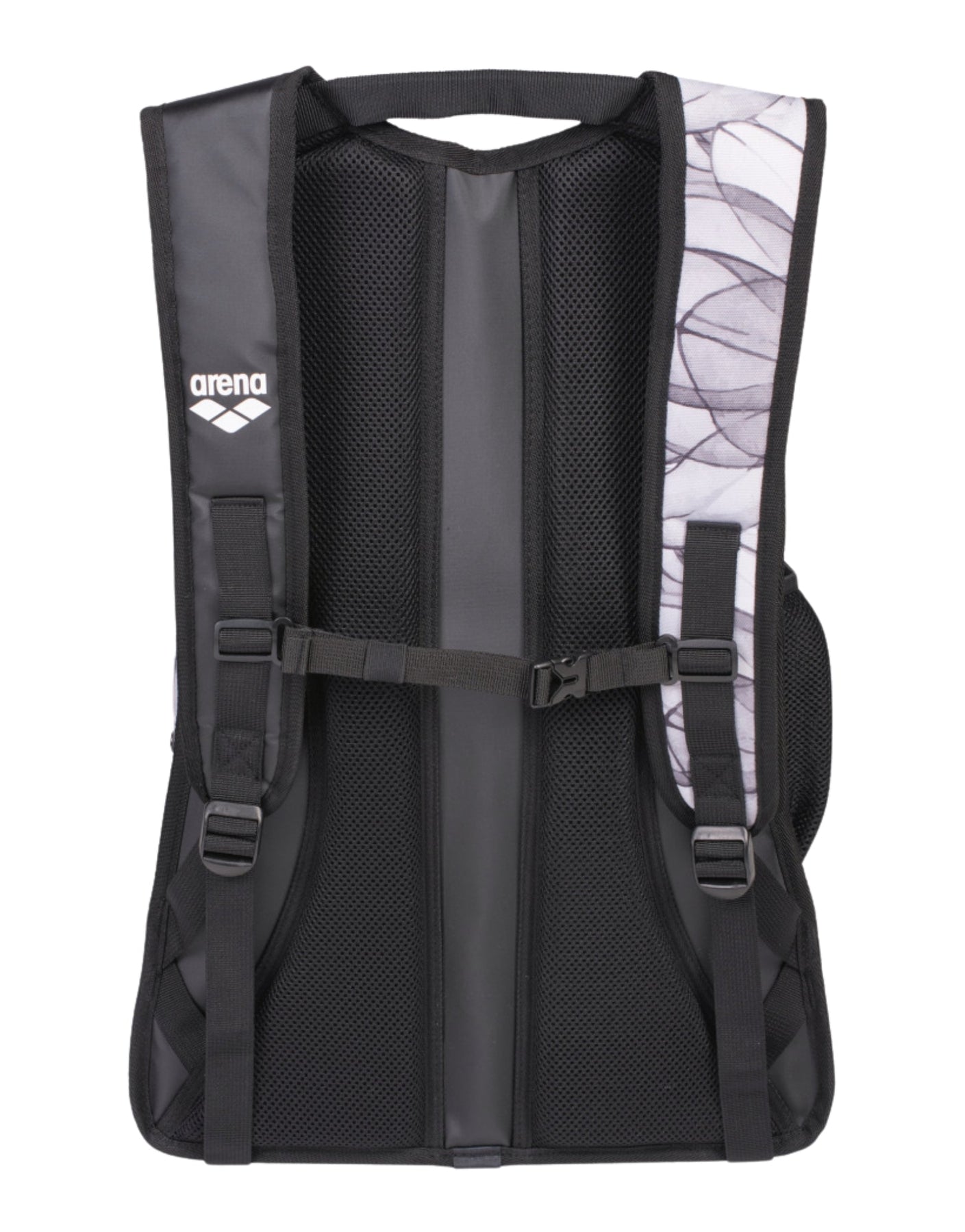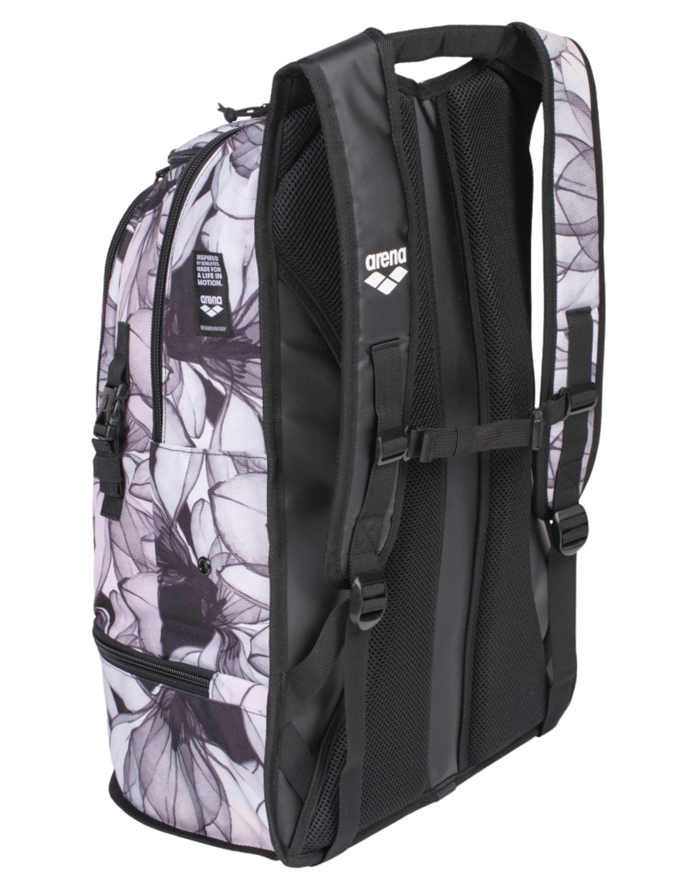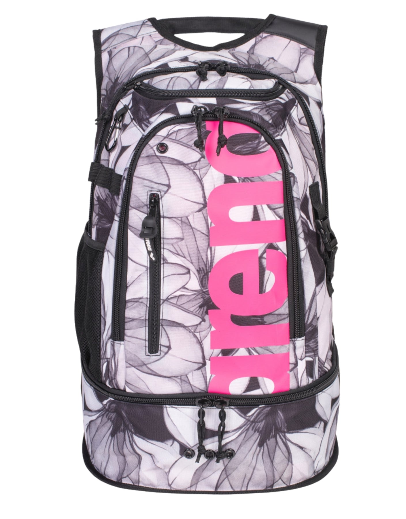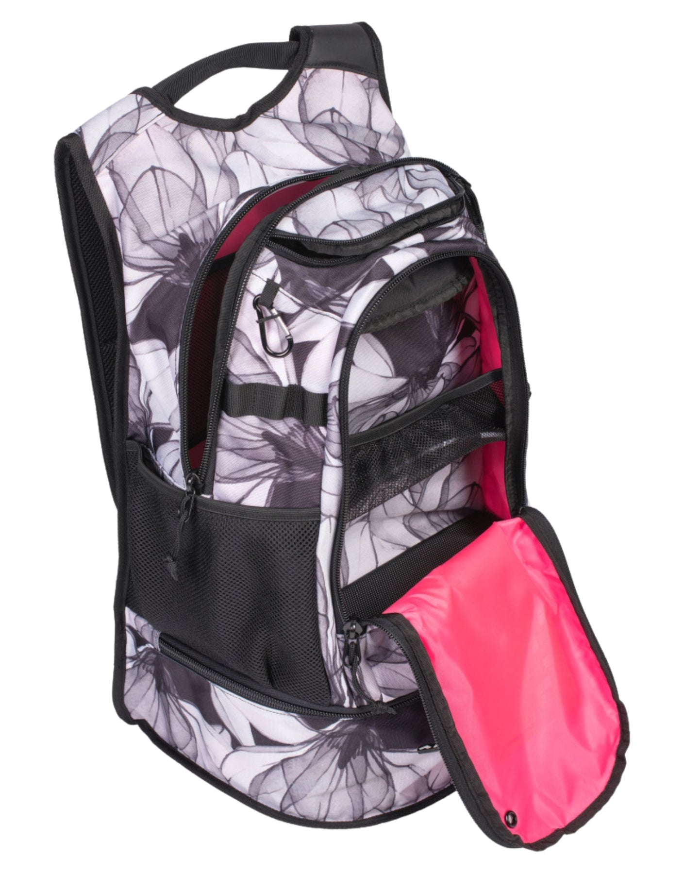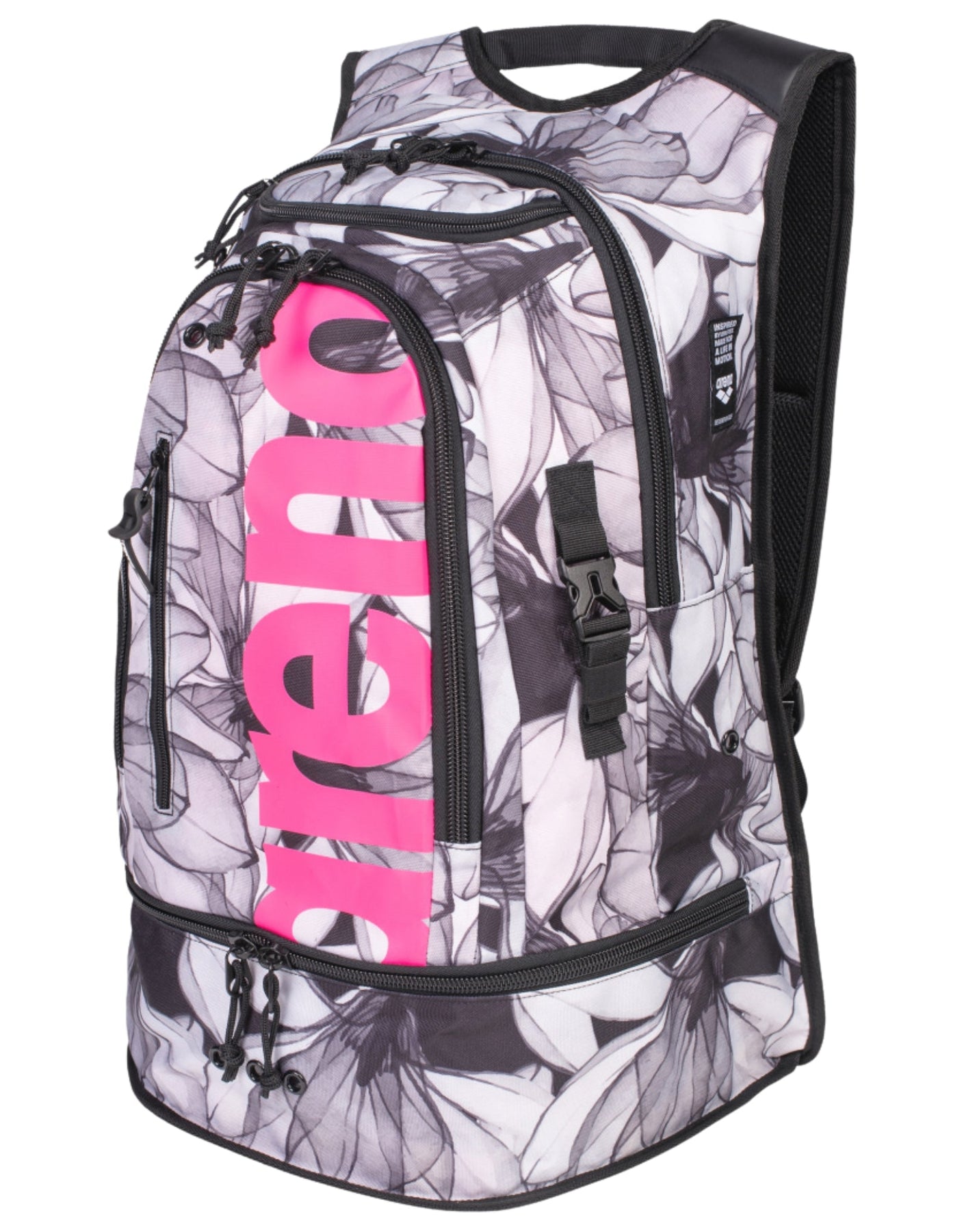 The Fastpack Seabed 3.0 Swim Bag from Arena is an essential piece of kit to keep all your swimming gear organised. There is an allover graphic pattern of flowers in blacks and pale-pinks on a light background with black trim and bright pink linings. Featuring a smart space management system, it allows you to quickly organise and easily access your swimwear and equipment. It comes with multiple compartments so that you can order your swim gear, such as kickboards, pull buoys, and wet and dry clothes. A large bag with superior cushioned support to the back.
