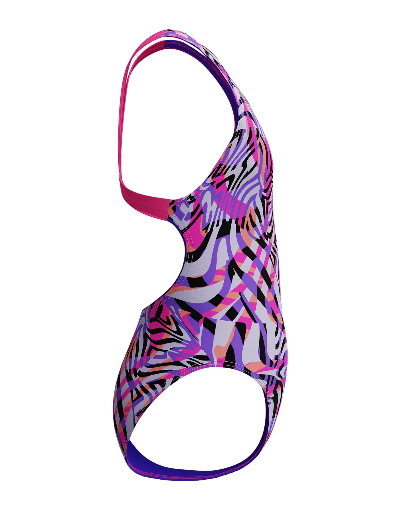The Girls Digital Allover Leaderback Swimsuit from Speedo is designed with an abstract print in pink. purple and black. The V-shaped leaderback design allows a full range of shoulder movement, which makes this suit perfect for training. The swimsuit is made from chlorinreistanct Endurance+ fabric for superb durability.