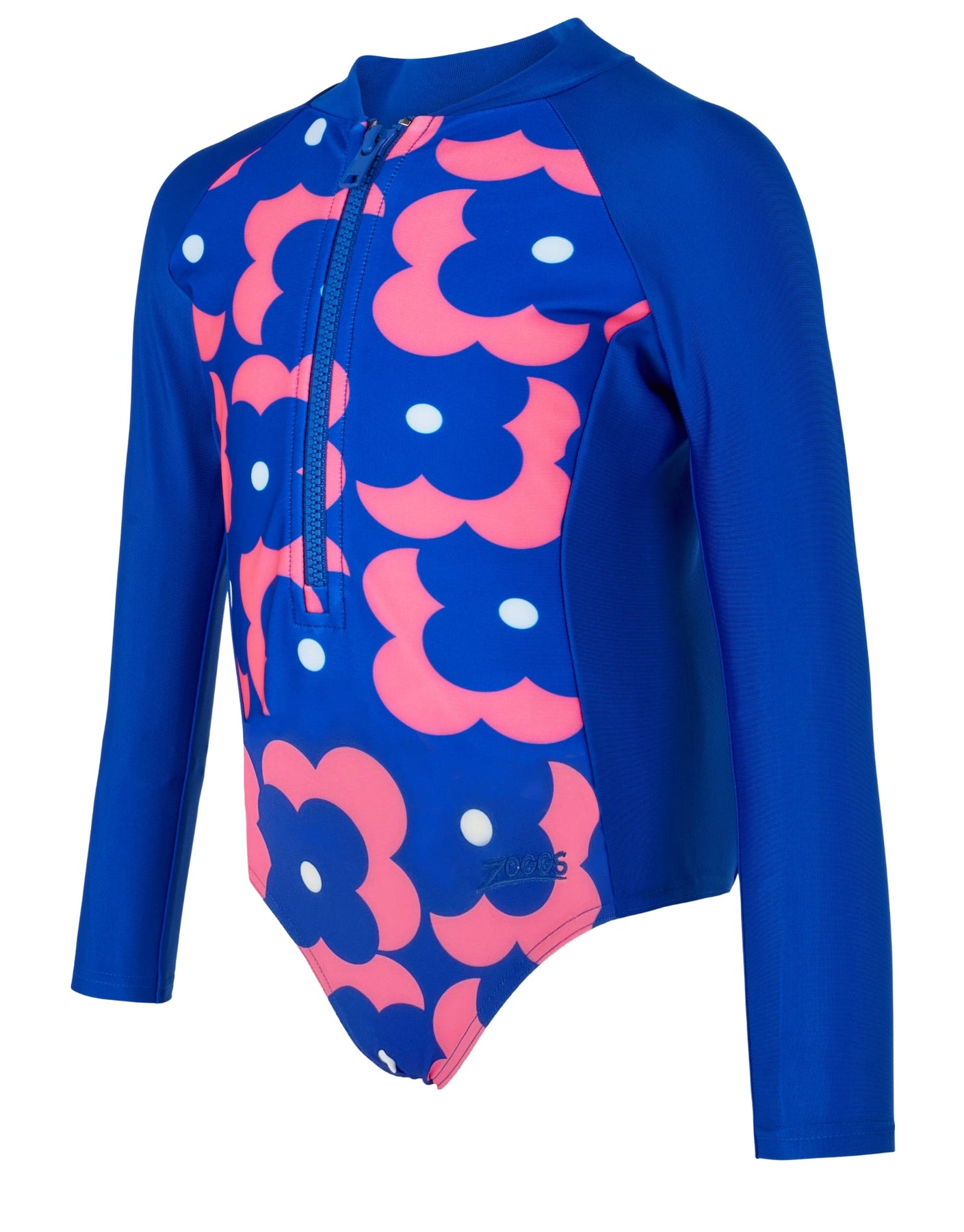 The Tots Disco Vibe Paddle Suit ensures that your child can play all day in and out of the water, with UPF 50+ sun protection. The long-sleeved paddle suit has a cheery, vibrant pattern of graphic flowers to the front of the suit in pink and blue, with a plain blue back. There is a handy half-zip for easy removal, is super comfortable and soft using Ecolast fabric, made from recycled plastic bottles.