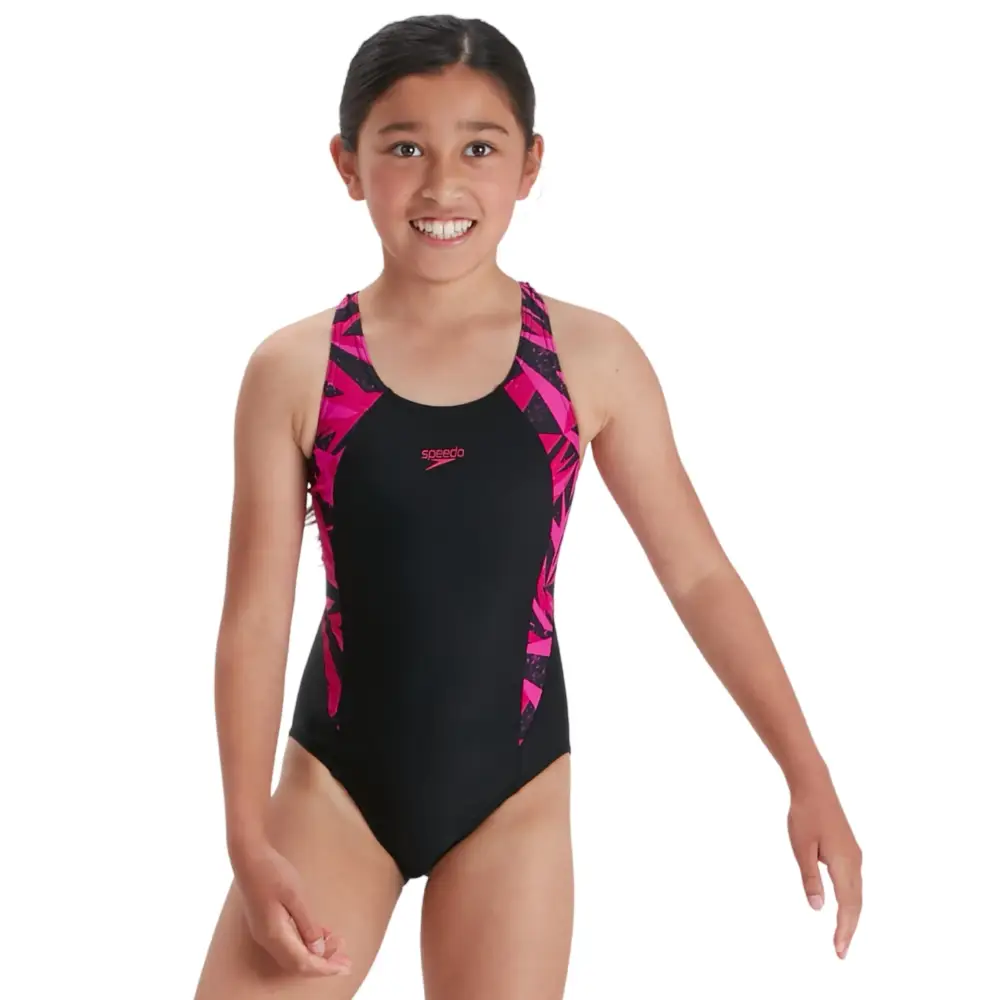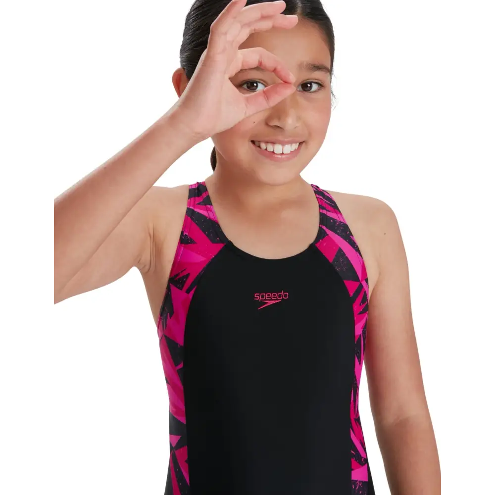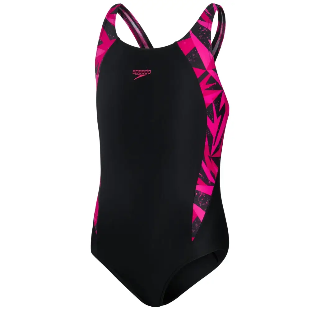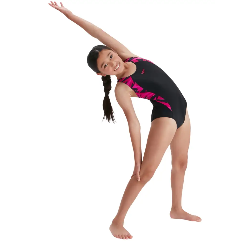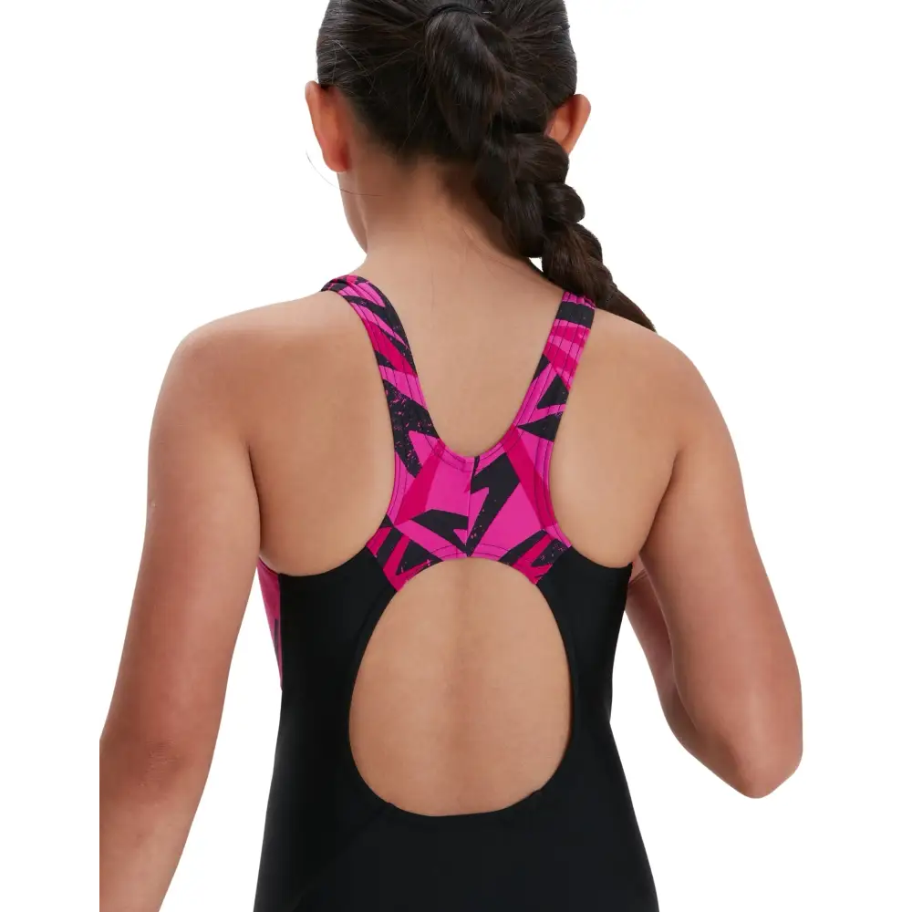 This sporty Muscleback swimsuit from Speedo features a curved splice graphic in pink of the ‘shattered’ Boom logo. Perfect for longer swim sessions, the muscleback style enables a full range of motion during swimming sessions. Quick-drying and stretchy, the Endurance10 fabric which is designed to keep its shape.
