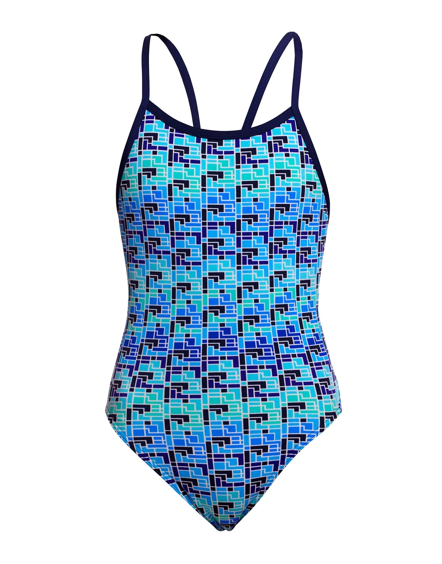 The Girls Jack Stack Single Strap Swimsuit from Funkita is designed with the beautiful geometric prints in blue all over. The thin single bind shoulder straps with open back provide greater freedom of movement, and the front lining and the medium leg cut ensure comfort and modest coverage. Made from Eco C-Infinity fabric, the swimsuit is 100% chlorine-resistant and has great durability, which makes it perfect for regular training and swimming sessions.