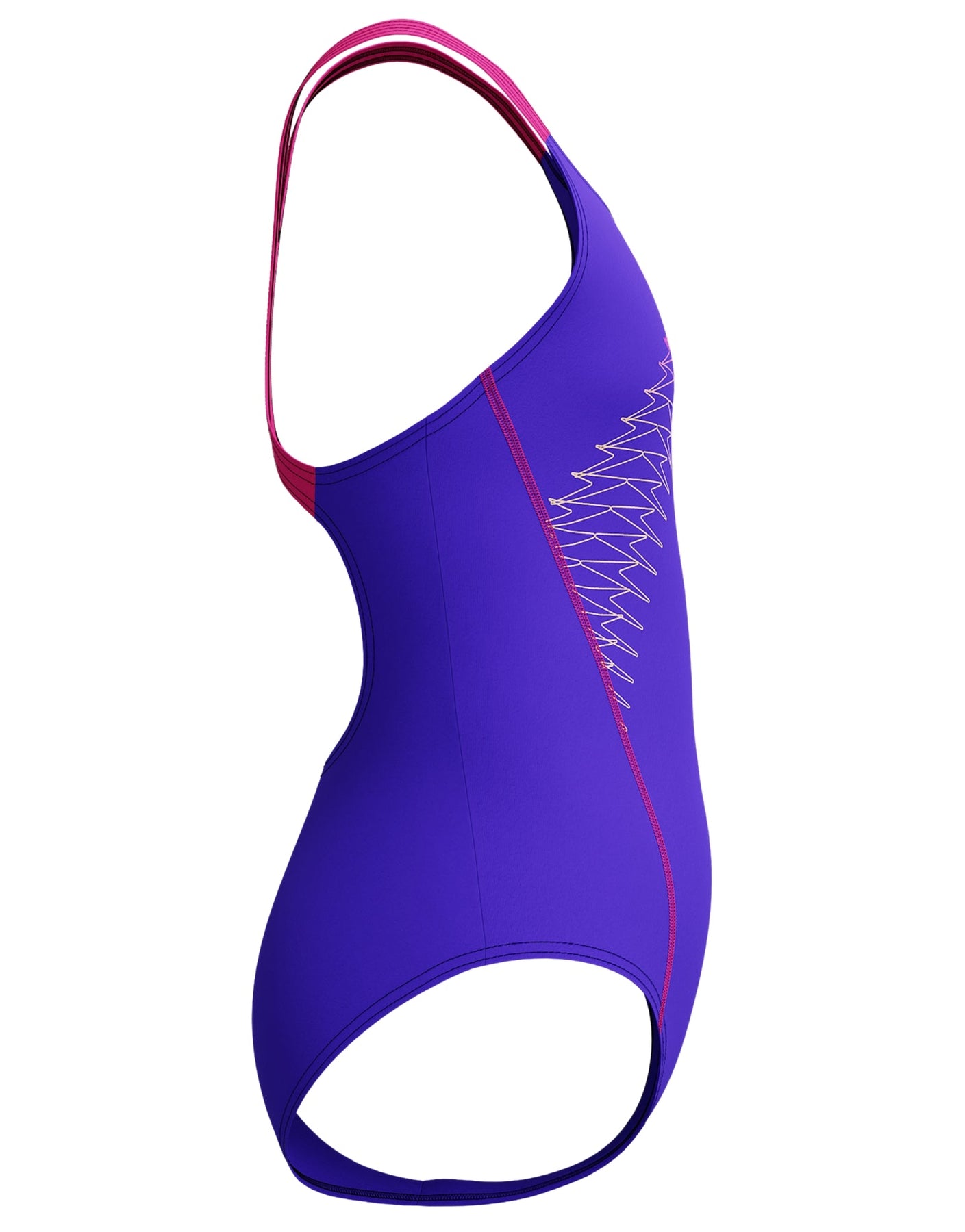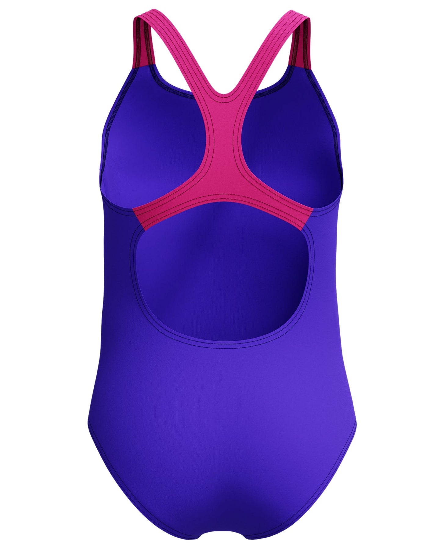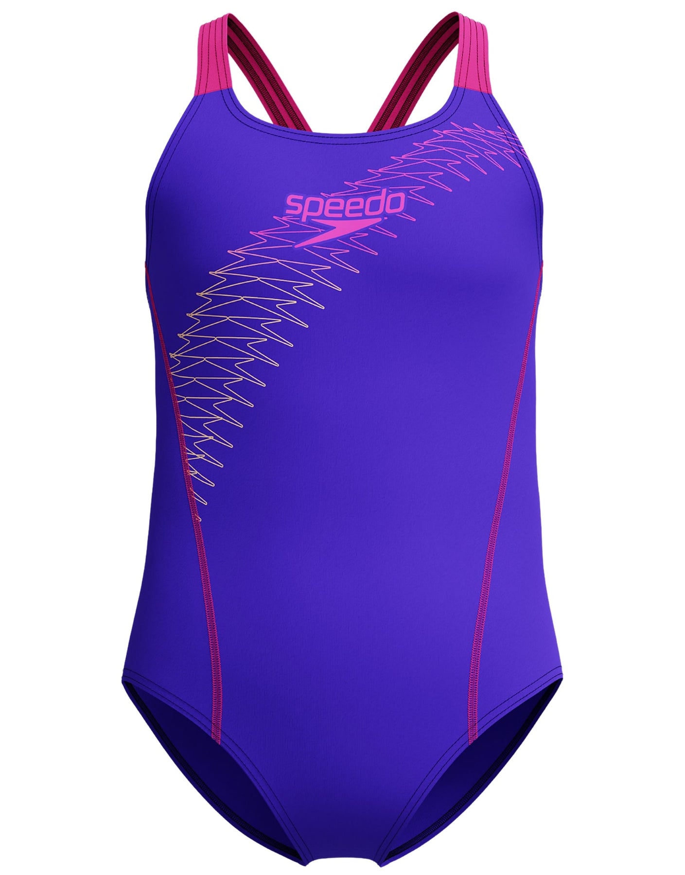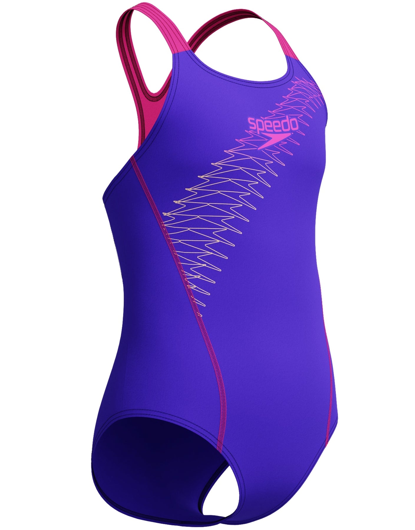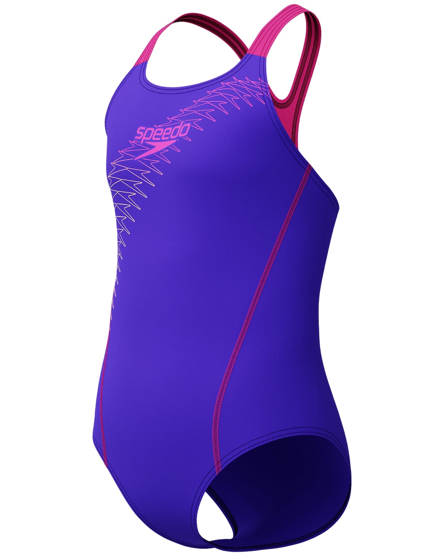 The Girls Medley Logo Medalist Swimsuit from Speedo features a beautiful vibrant purple with bright pink colour-pop straps and Boom logo graphic running diagonally across the swimsuit., while the Medalist back promotes shoulder movement and flexibility. Made from chlorine-resistant EnduraFlex fabric, which fits like new for longer with CREORA HighClo™. Body made of 80% Nylon, 20% Elastane (Creora® HighClo).