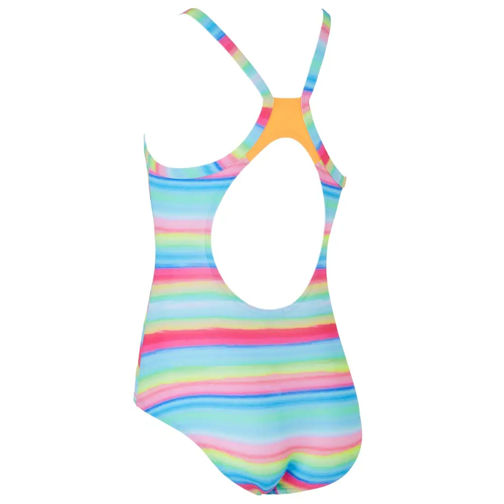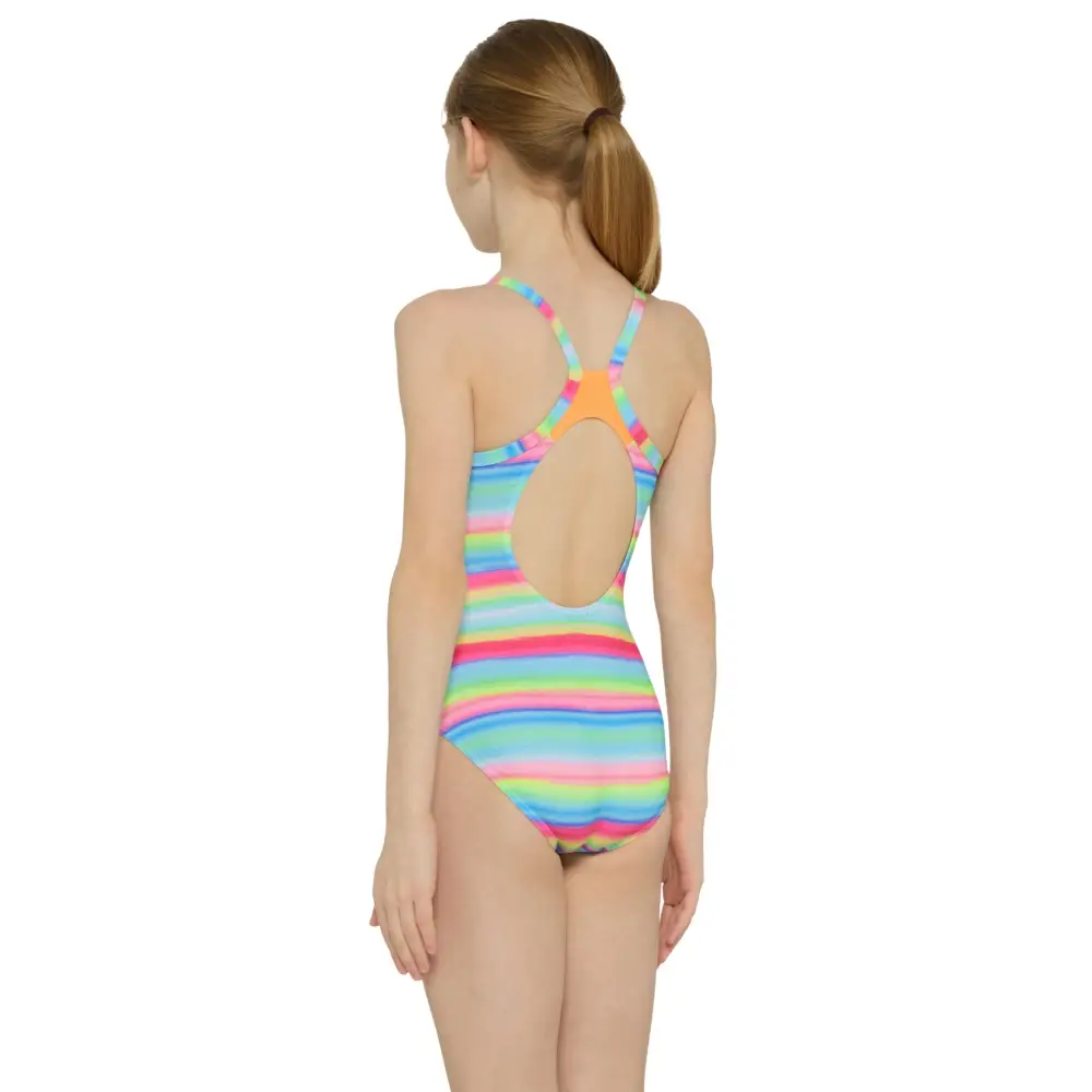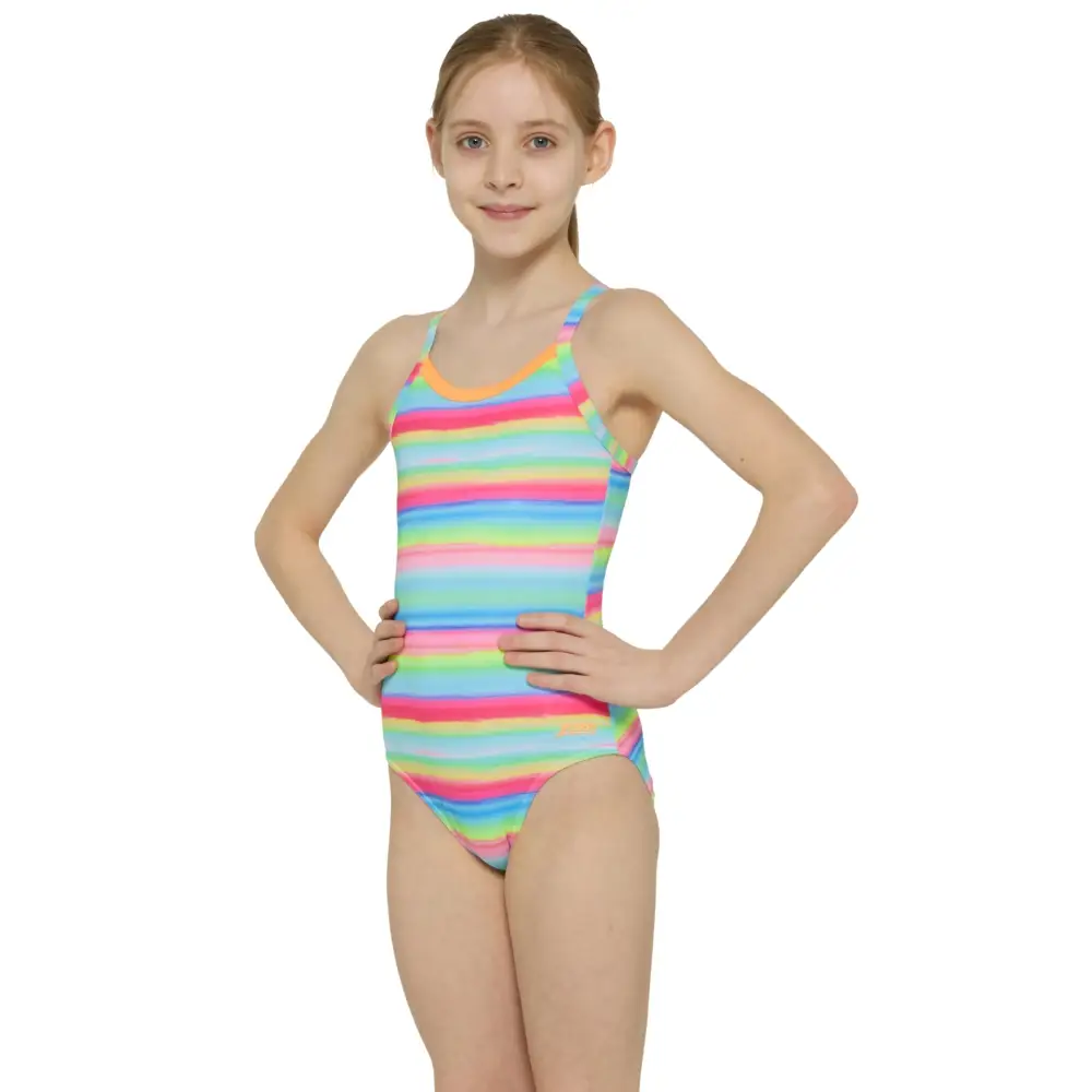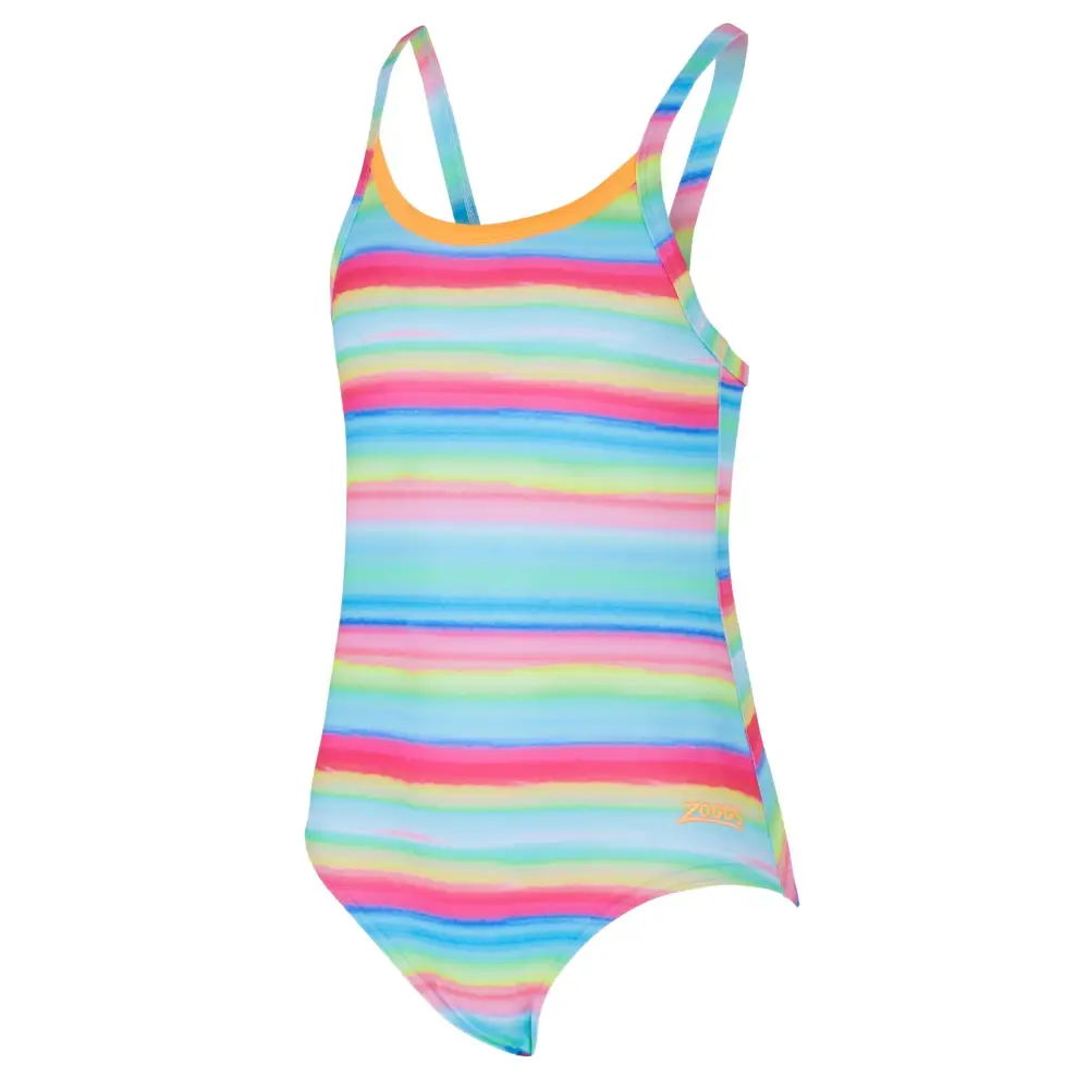 The Girls Seychelle Strikeback Swimsuit from Zoggs is ideal for frequent swimming sessions and training. The strikeback style ensures freedom of movement while swimming, with its cross back straps and open back. It has a front lining for modesty. Made from Ecolast fabric, the swimsuit provides chlorine resistance and has great shape retention.