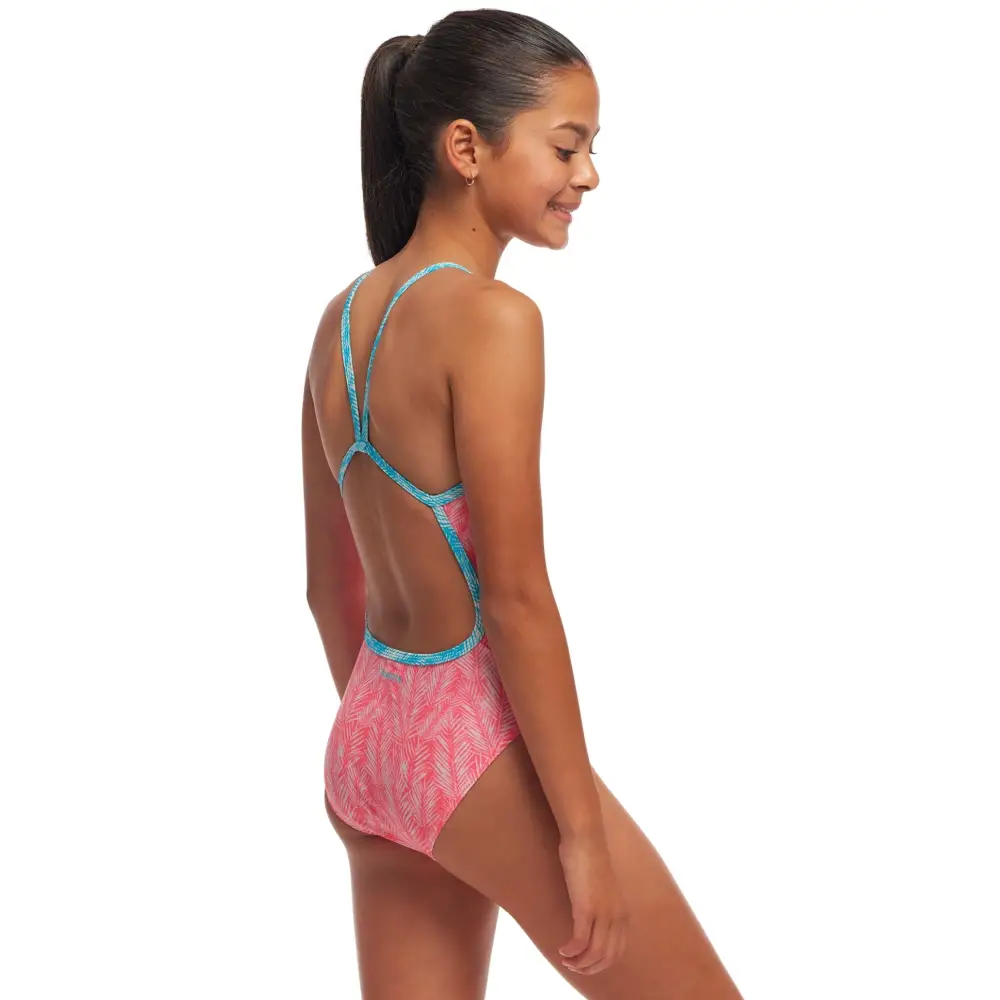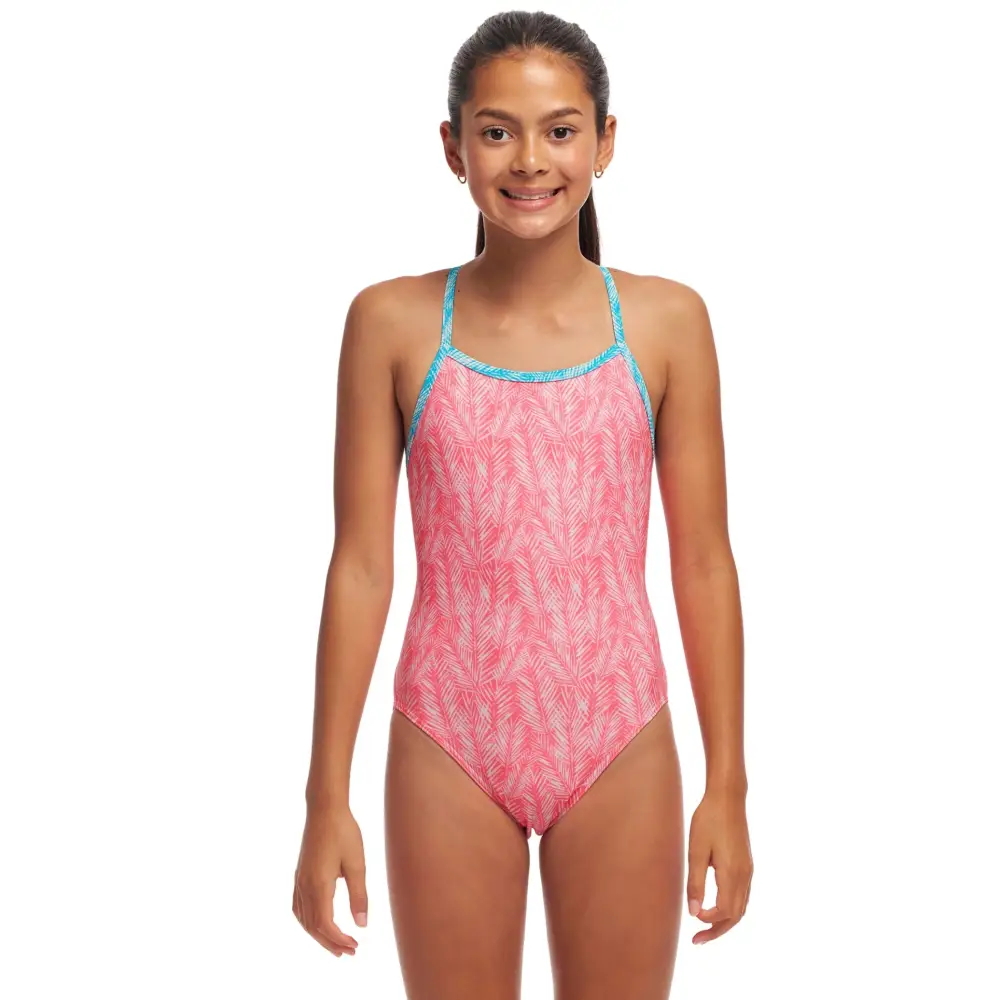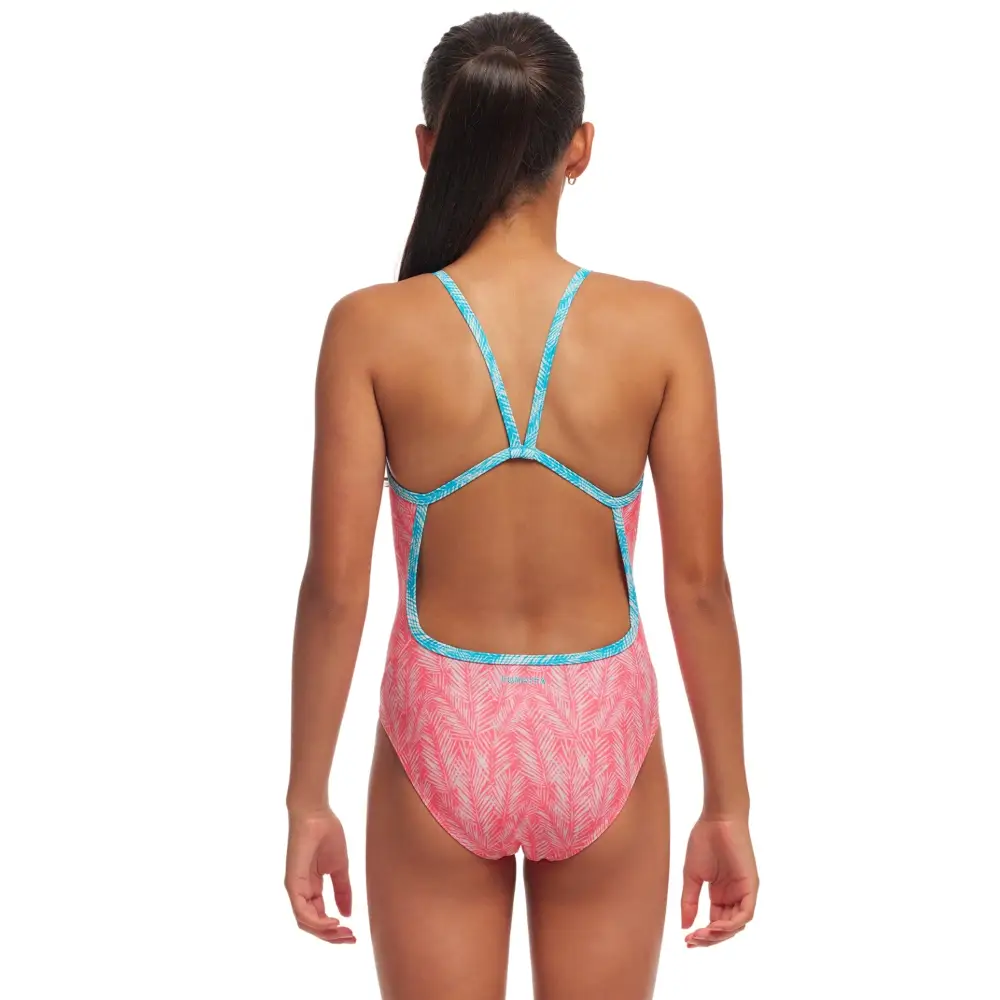 The Girls Sweet Releaf Single Strap Swimsuit from Funkita is an ideal swimwear for regular swimming sessions and training, featuring a soft design of leaves on a pink background. The single bind straps in aqua blue, sit comfortably on your shoulder for greater freedom of movement and full front lining, moderate leg height and rear coverage will provide a comfortable but secure fit. Made from eco-friendly C-Infinity fabric, this swimsuit offers great durability and high chlorine resistance.