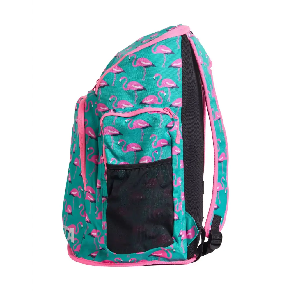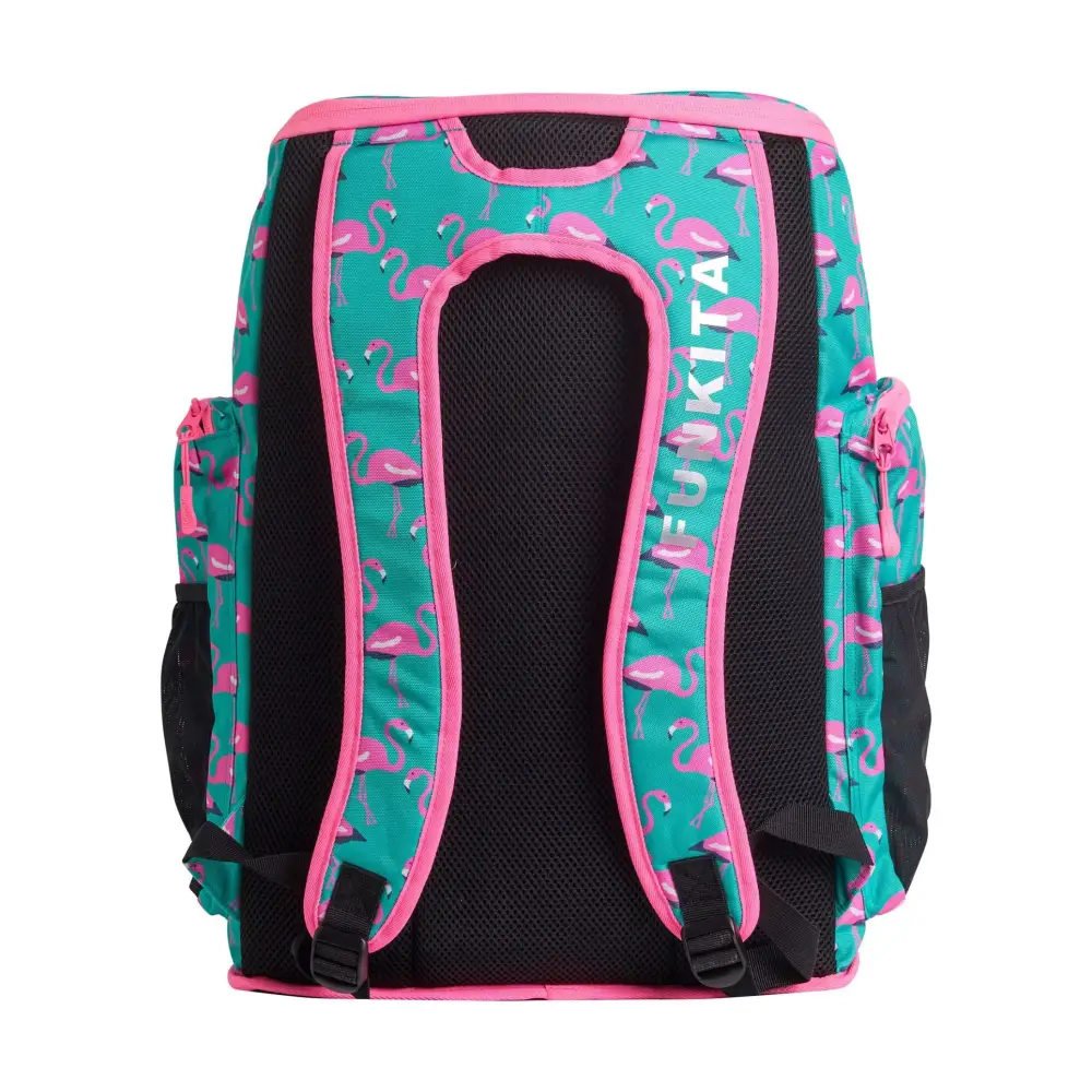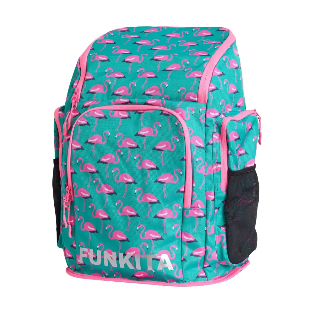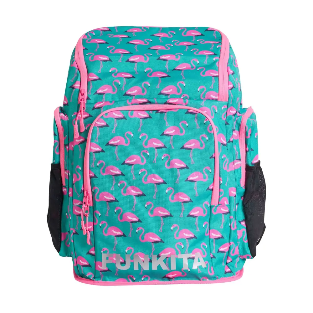 The Go Flamingo! Space Case 40L Backpack by Funkita features a vibrant mint green and pink flamingo digital pattern, combining style with practicality. With a spacious 40L capacity, it includes a main compartment, internal pockets, a hidden fabric-lined goggles section, drink holders, and a large laptop pocket. Perfect for swimmers, students, or commuters, this backpack keeps all your gear organized and easily accessible