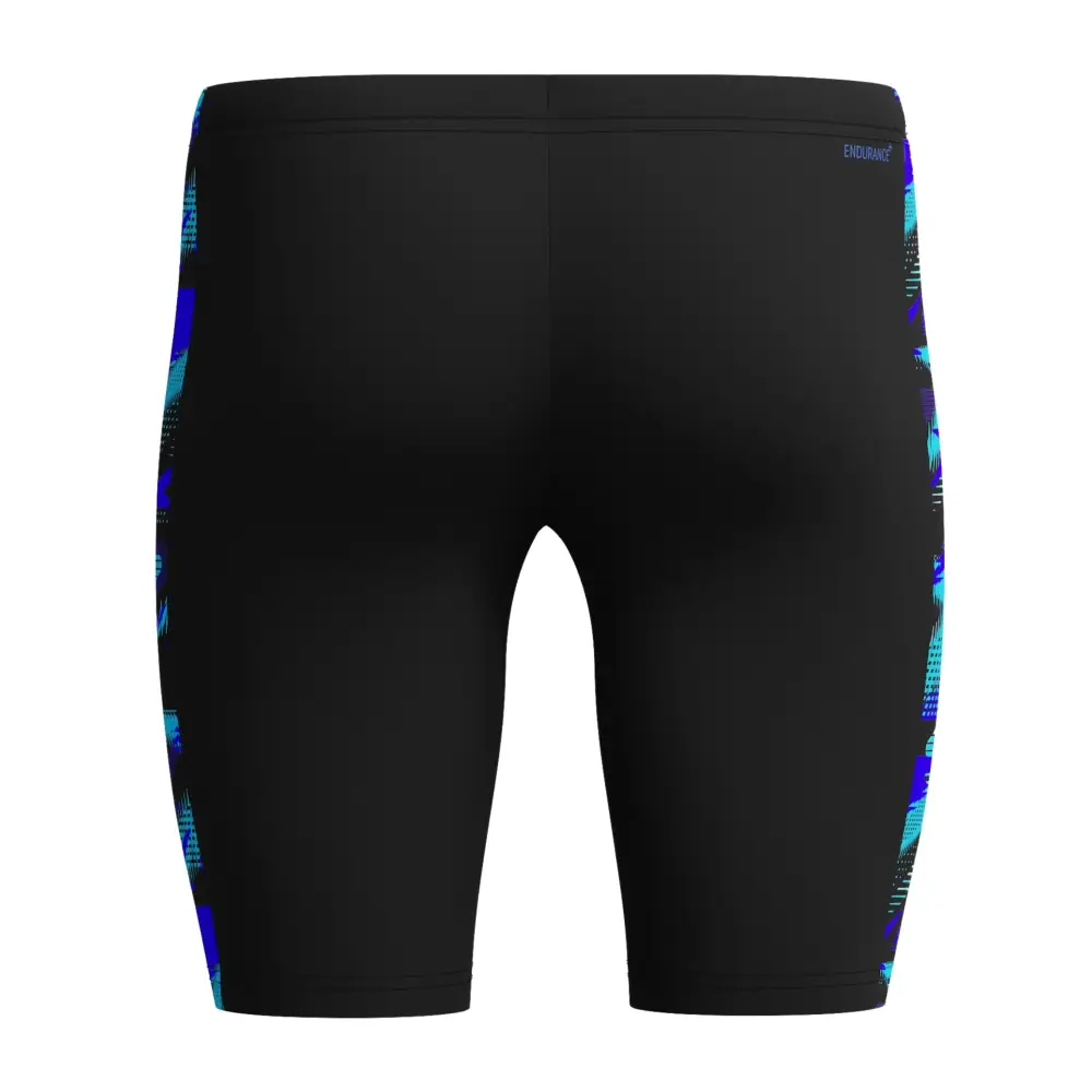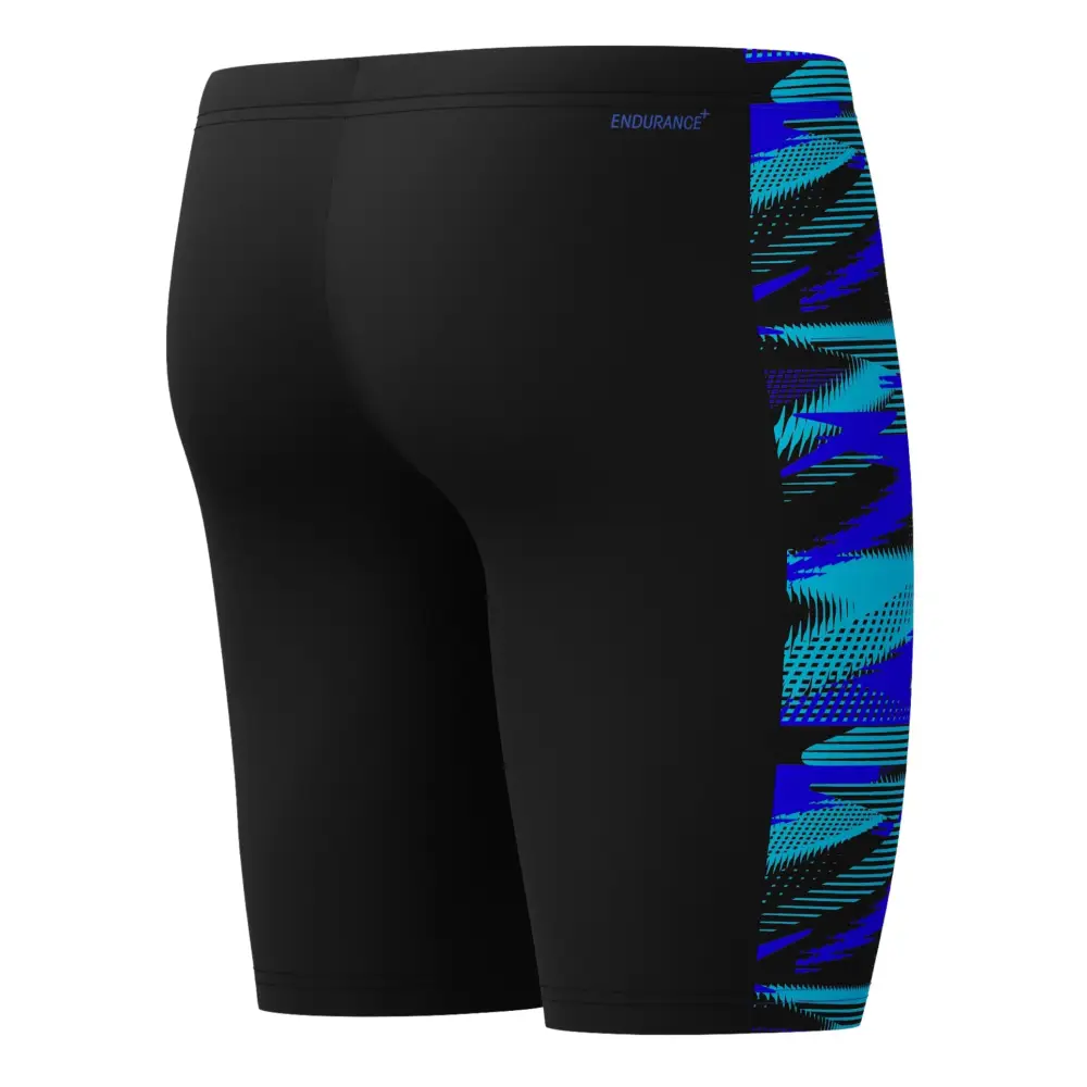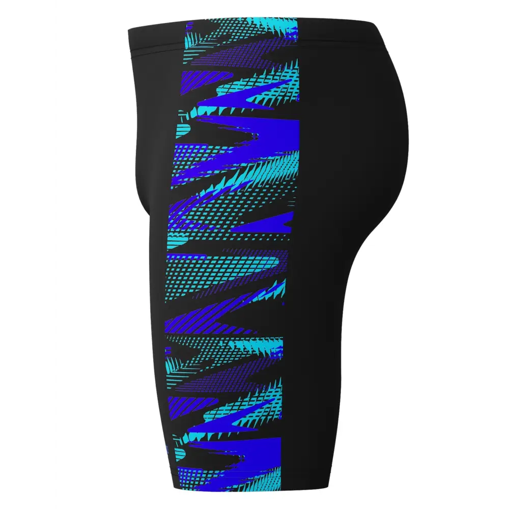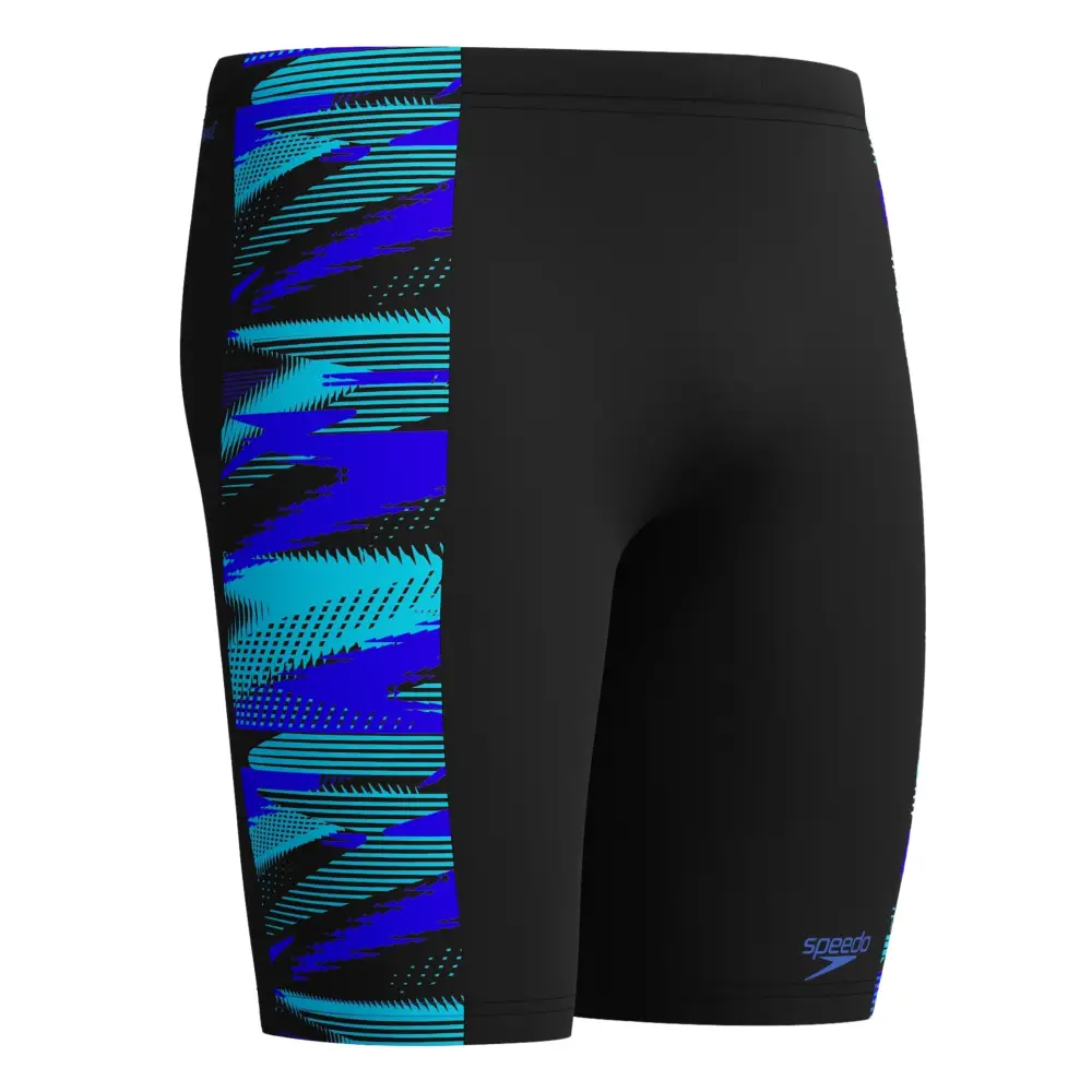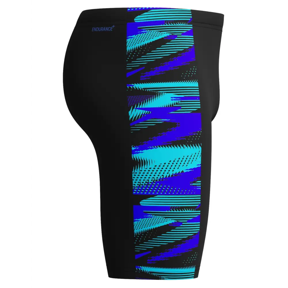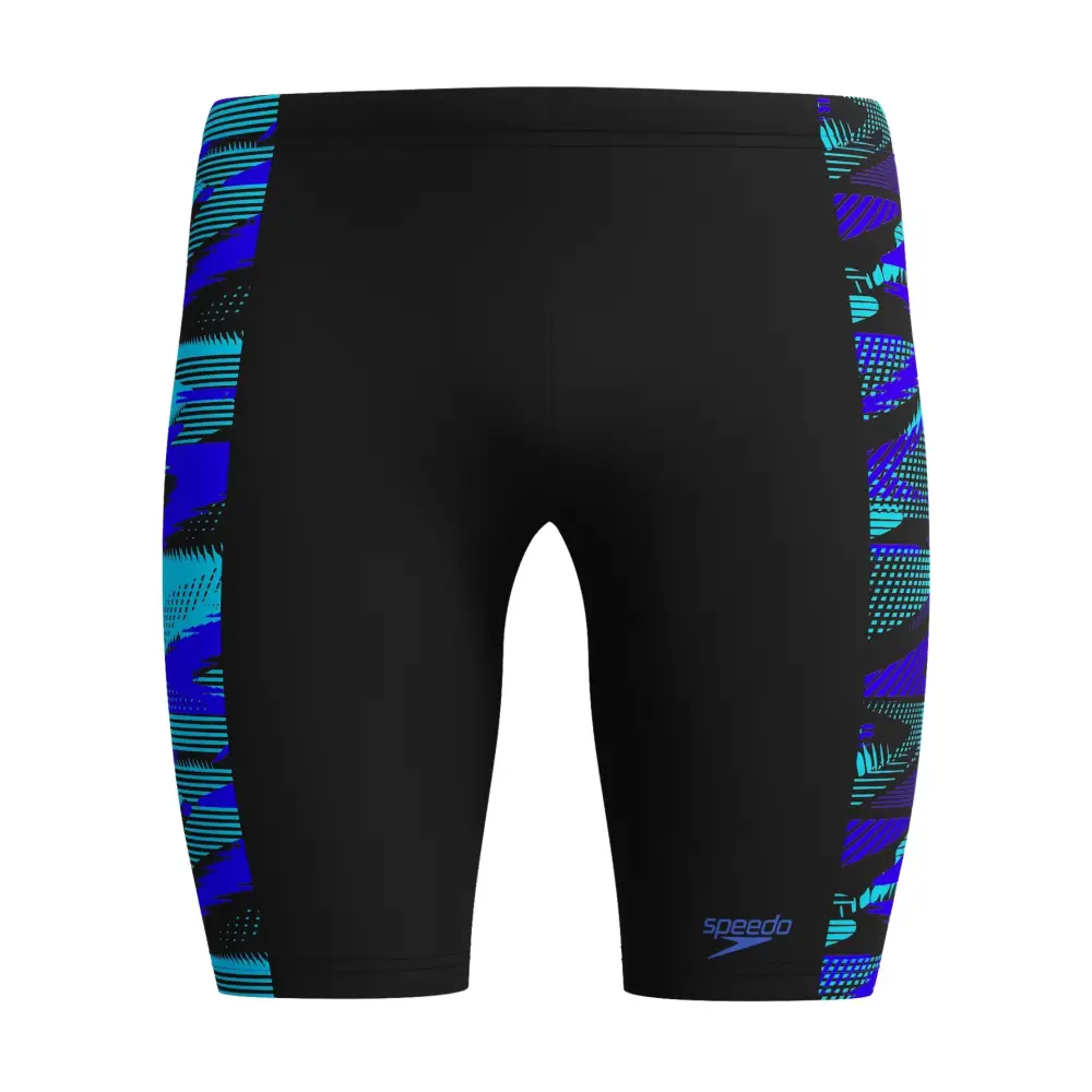 The Hyperboom Panel Swim Jammer from Speedo features a classic background of black with patterned panels running down each leg in bright blue and aqua green. Perfect for swim training and recreational use, these jammers feature Endurance+ fabric for high chlorine resistance and durability.