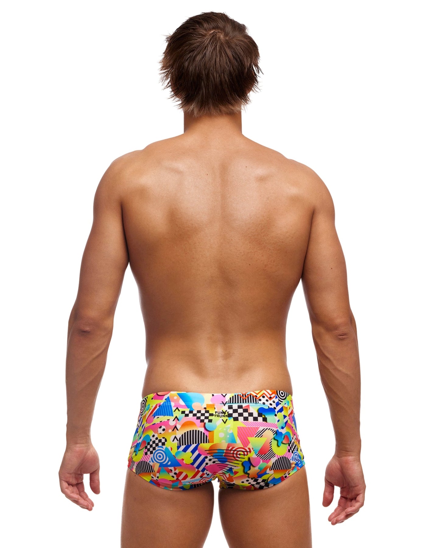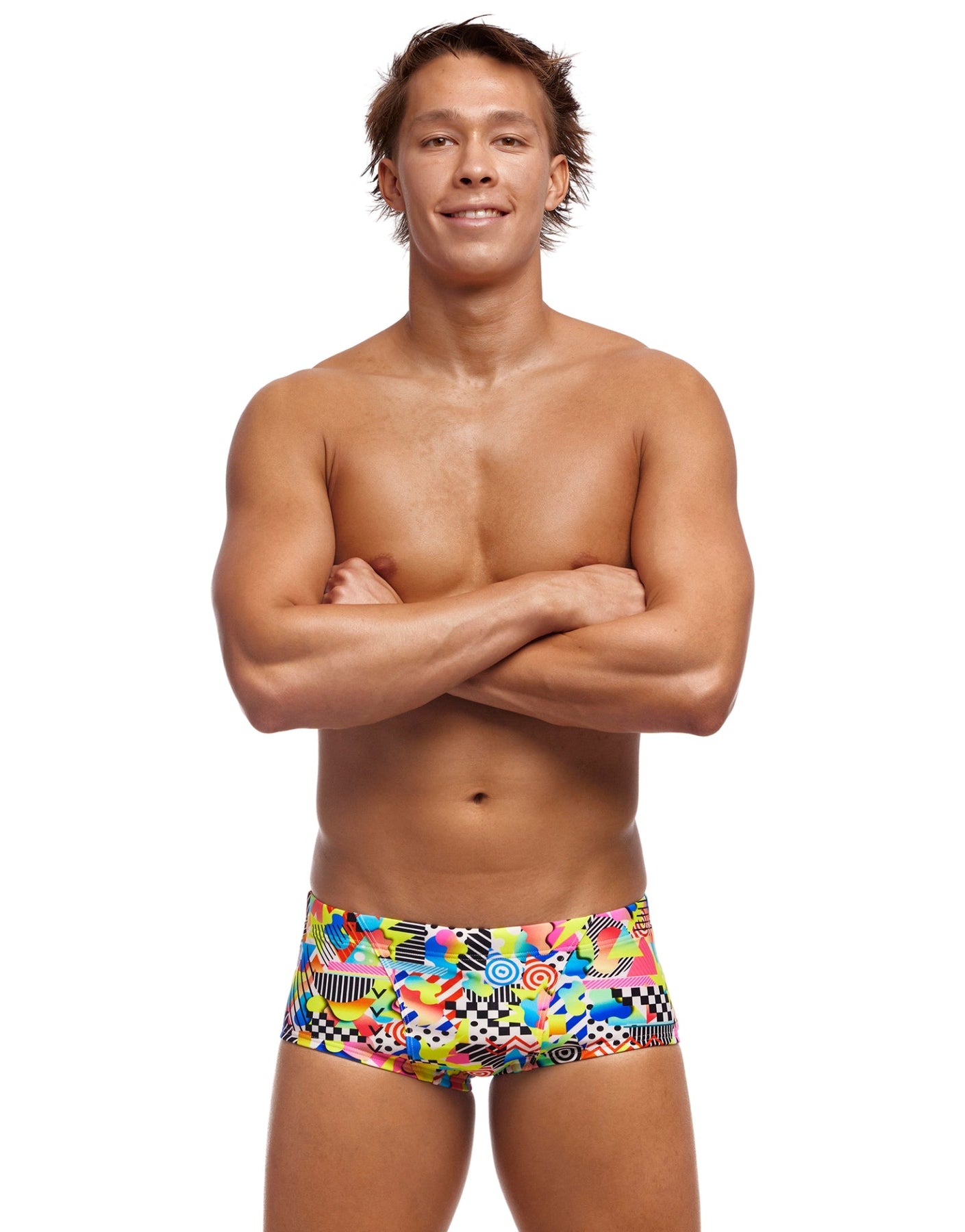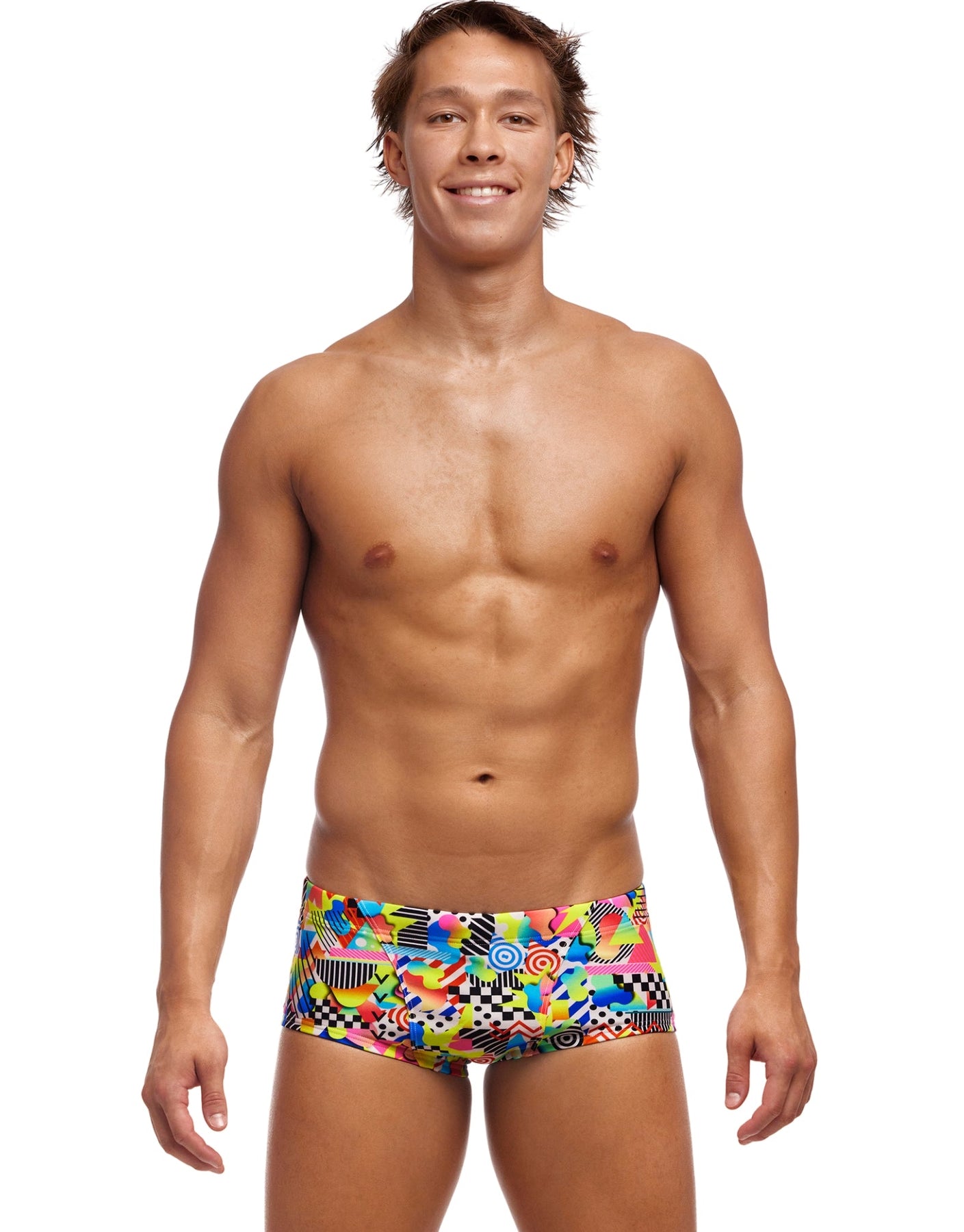 These Junk Yard Classic Swim Trunks from Funky Trunks for men feature a graffiti inspired pattern in blacks, blues, pinks and yellows. They have 16.5cm sides and stitched front pouch and double lining for added comfort and support. With a draw cord for added security and wide elastic leg opening and waistband for extra comfort. Made from C-Infinity fabric, a 100% Italian polyester for chlorine resistance and extra durability.