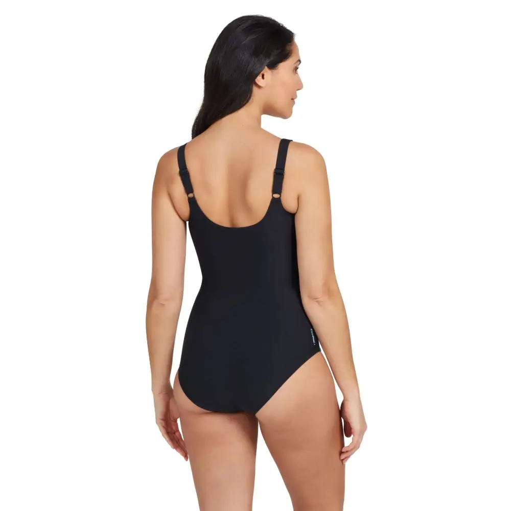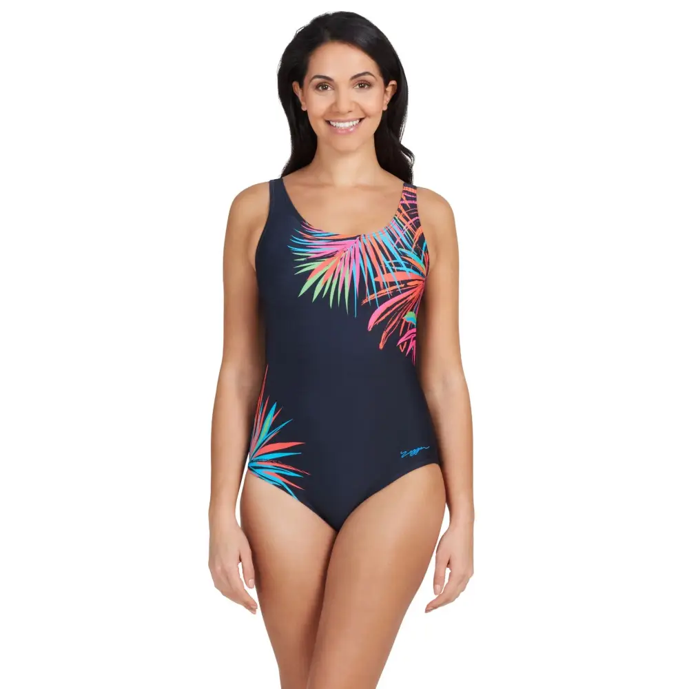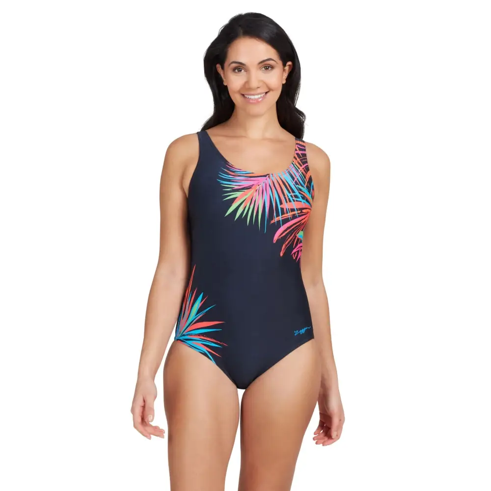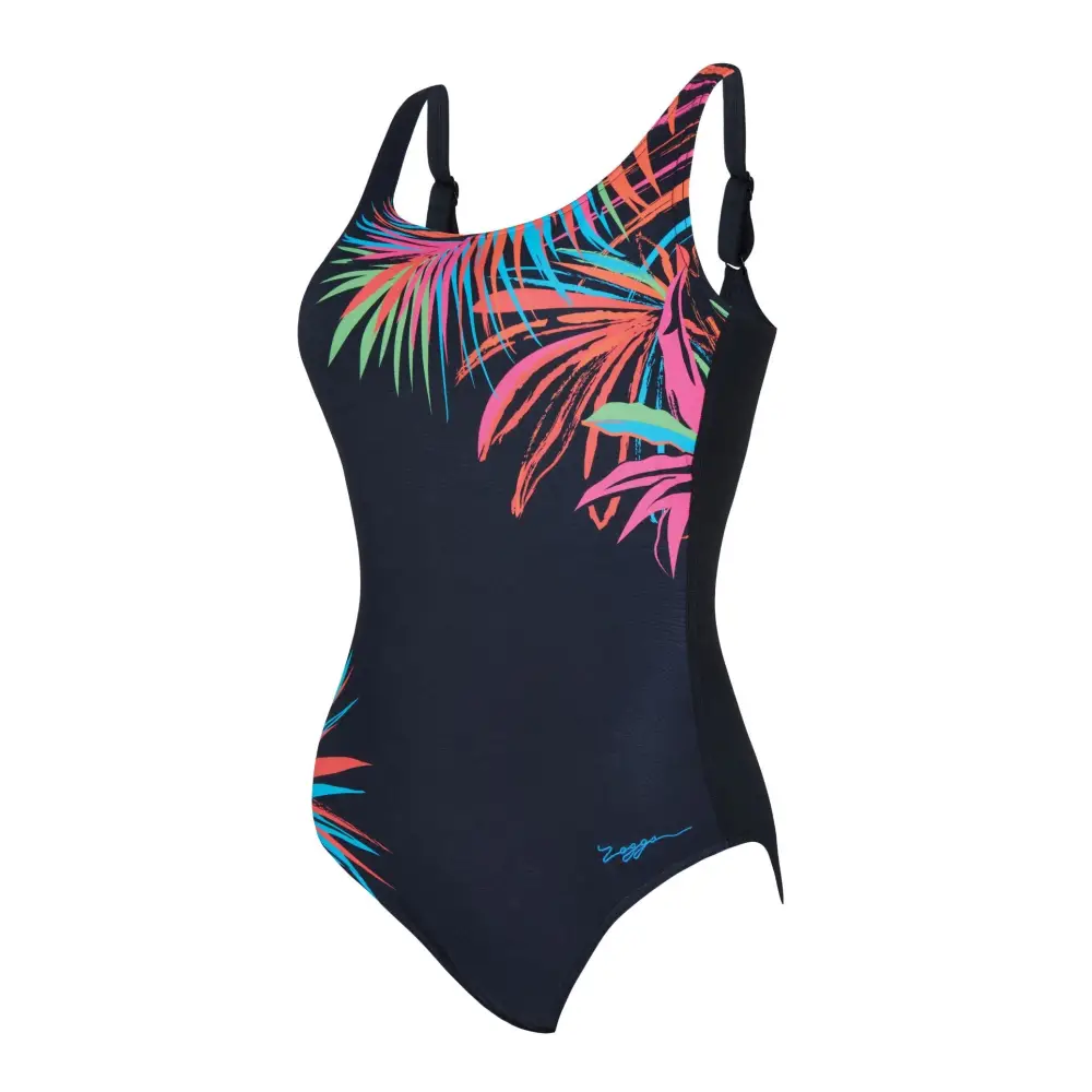 The Maya Adjustable Scoopback Swimsuit from Zoggs features vibrant leaf prints. The adjustable wide straps offer the perfect fit with scoopback, mesh tummy control, and full foam cups for support. Made from eco-friendly Ecolast+ fabric, this swimsuit is quick-drying, durable and 100% chlorine resistant.