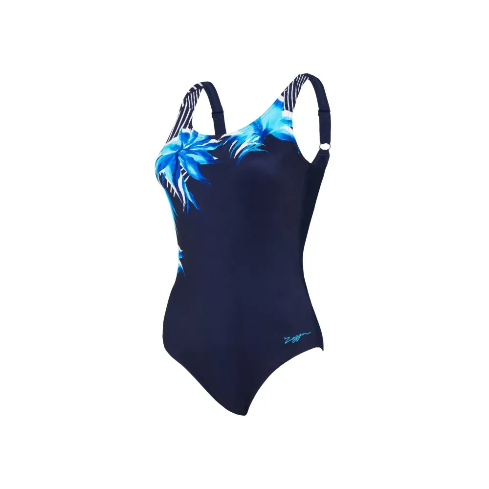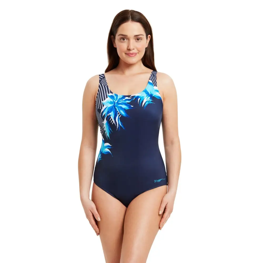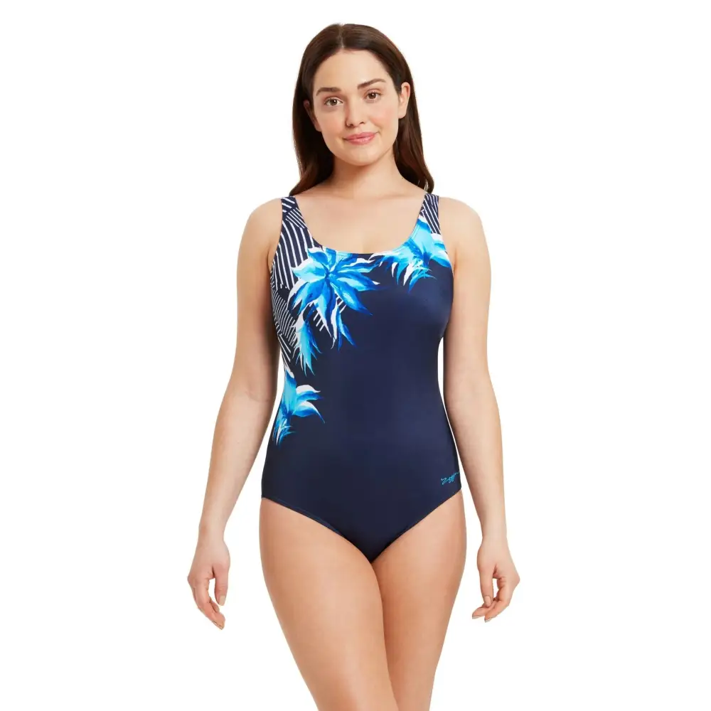 The Ocean Treasure Adjustable Scoopback from Zoggs is another of Zoggs most desirable swimsuits. With fixed foam cups, tummy control, medium leg height and adjustable straps all on Zoggs best Ecolast fabric. With a beautiful mix of blue, navy and white for a nautical floral print. You will be guaranteed to look and feel great.