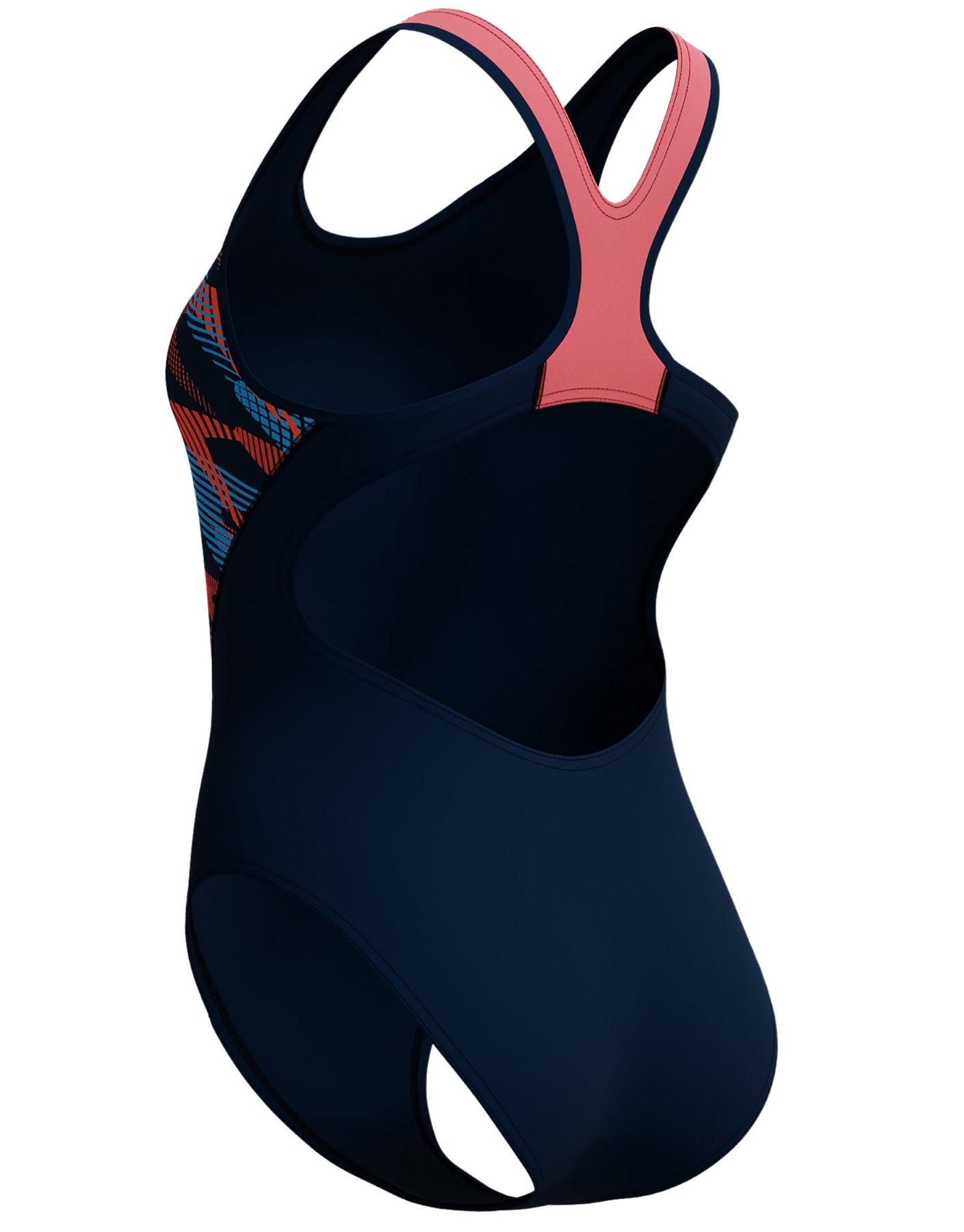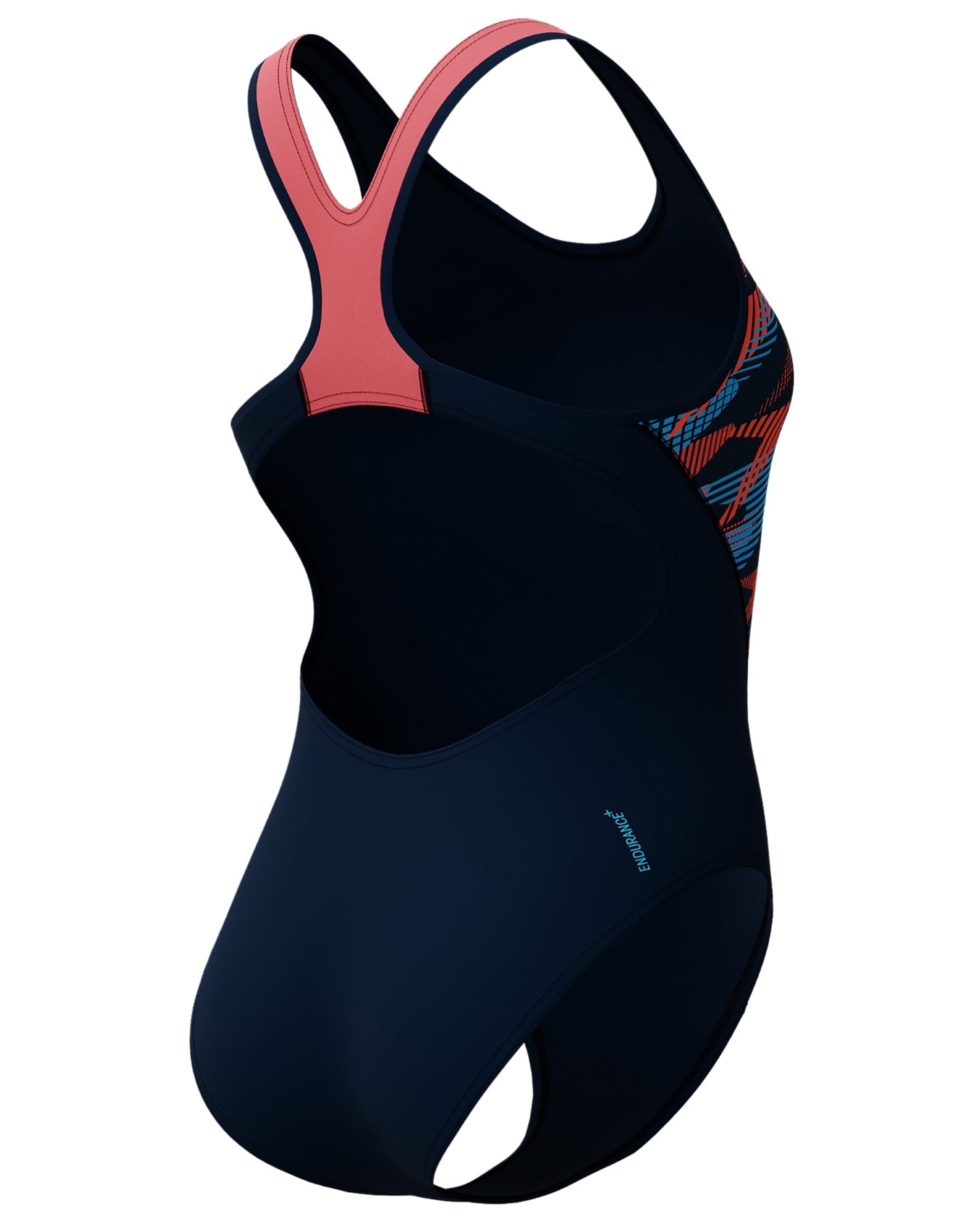 The Women's Placement Laneback Swimsuit from Speedo features contrast straps in coral and splices of Zoom Boom print add contour to this swimsuit on a background of navy. The Laneback design offers flexibility, with a supportive elastic bust underband and PBT liner to help minimise bust movement. Quick-drying Endurance+ Max fabric offers high chlorine resistance and durability, so you can swim-wash-repeat.