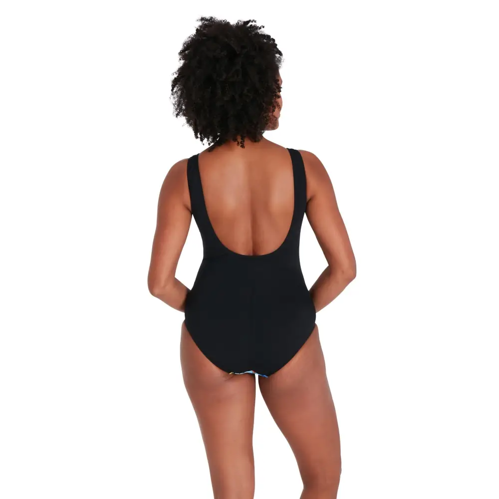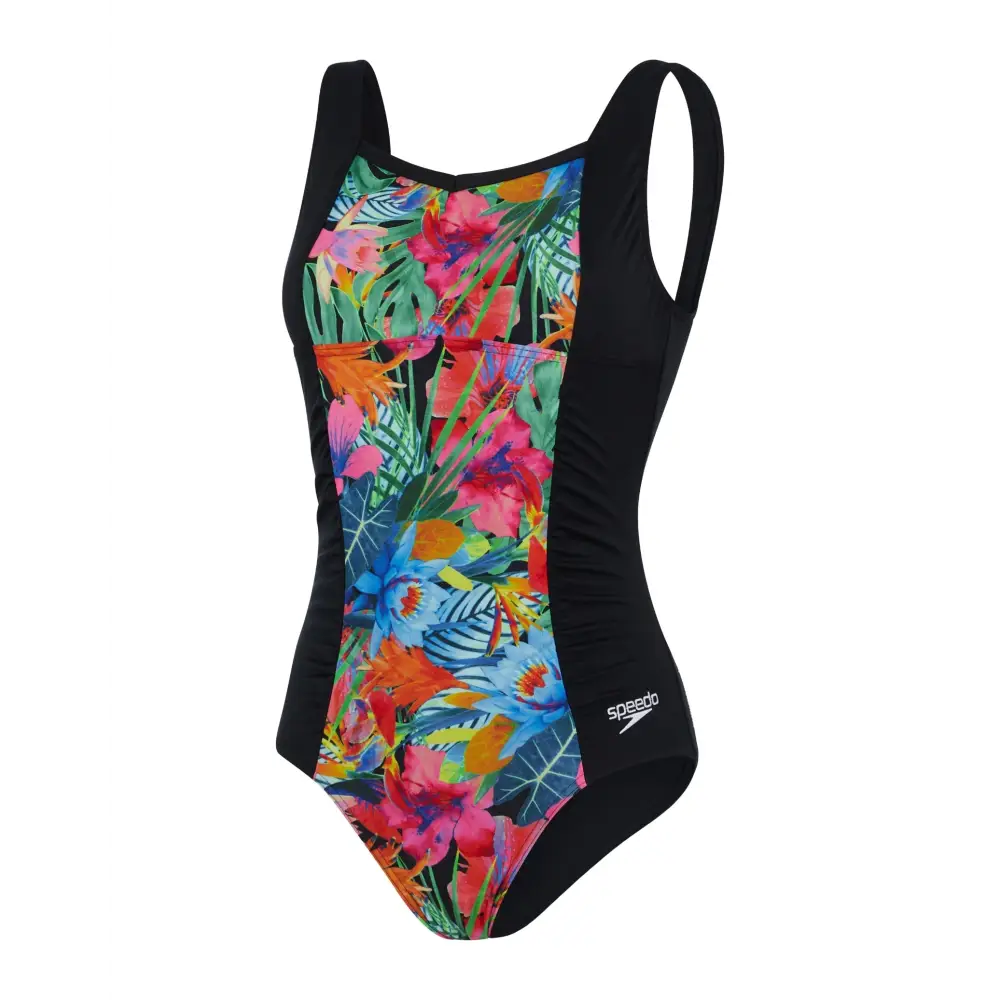The Printed Contour Shaping Swimsuit from Speedo is designed with a montage of photo-real tropical floral prints. The scoop back design allows you easily get in and out of the swimsuit while the lined bust support and low leg height provide great coverage when swimming. Made from durable and quick-drying Eco Endurance+ fabric, this swimsuit offers 100% chlorine resistance and long-lasting performance.