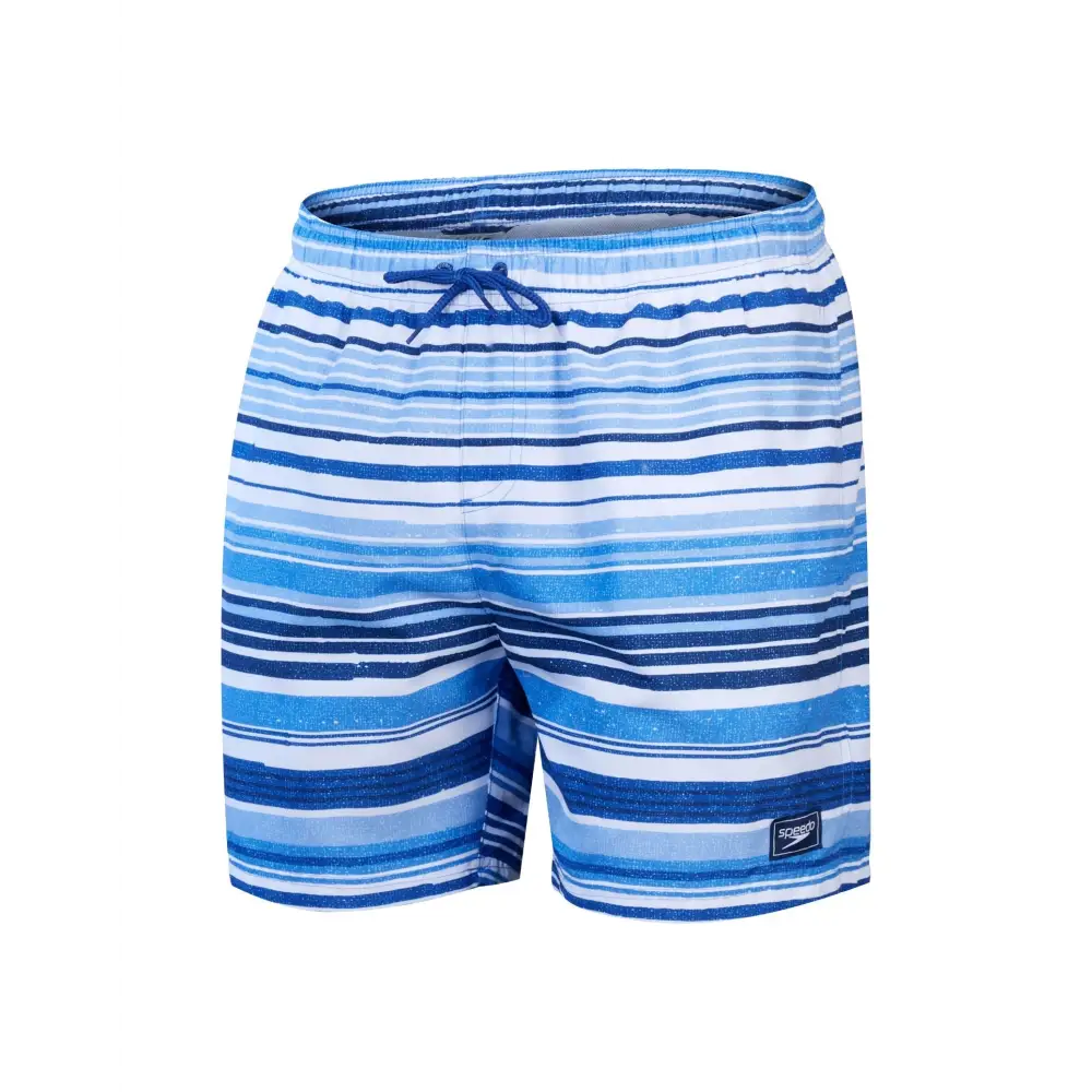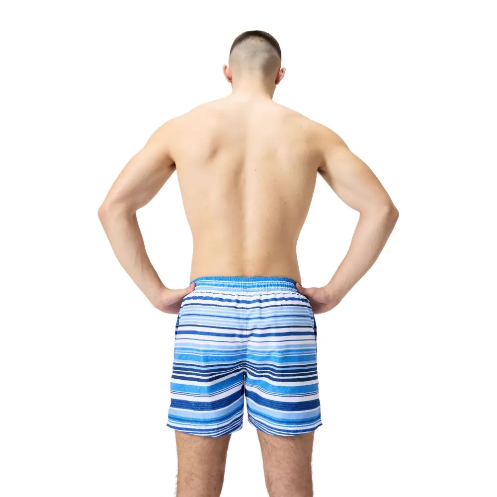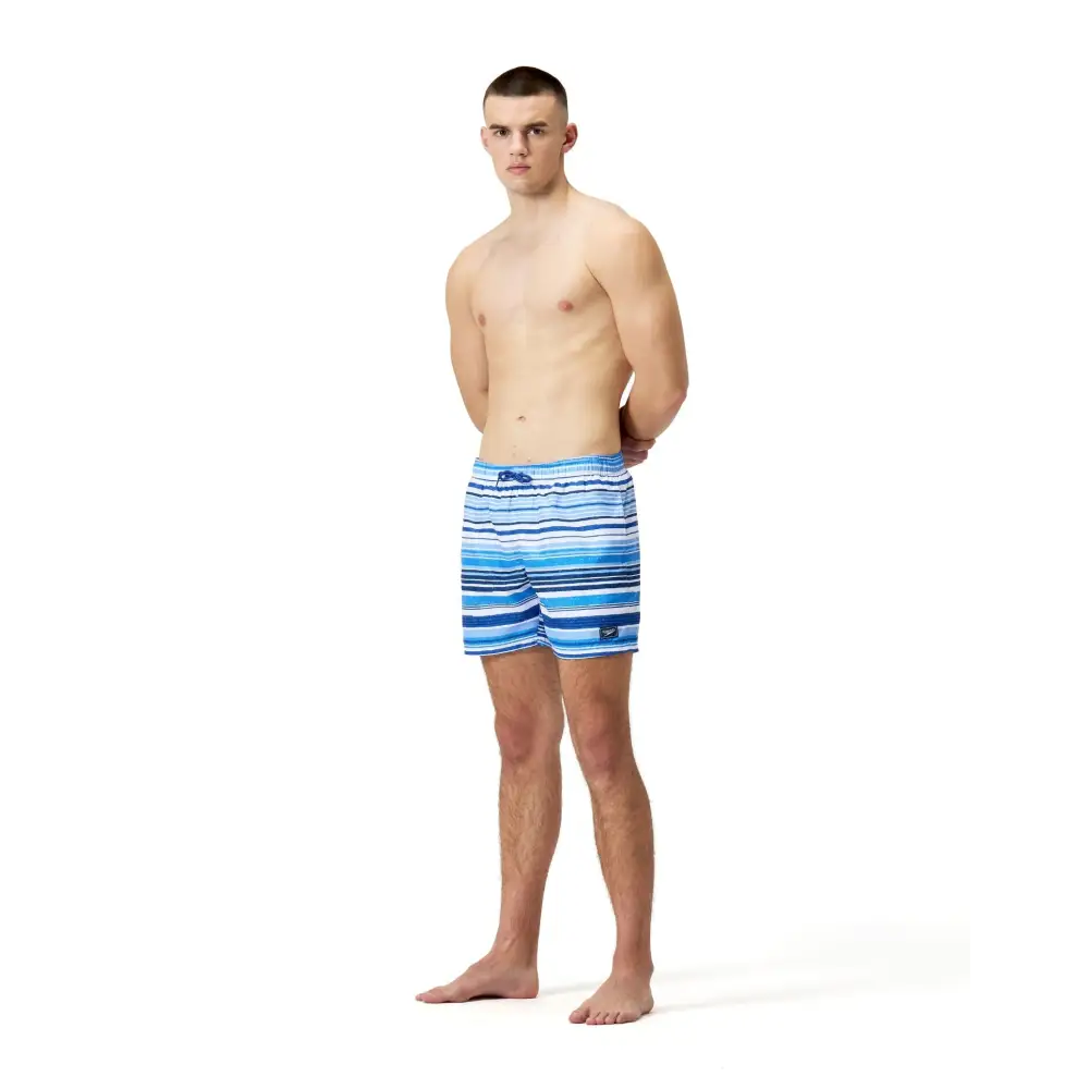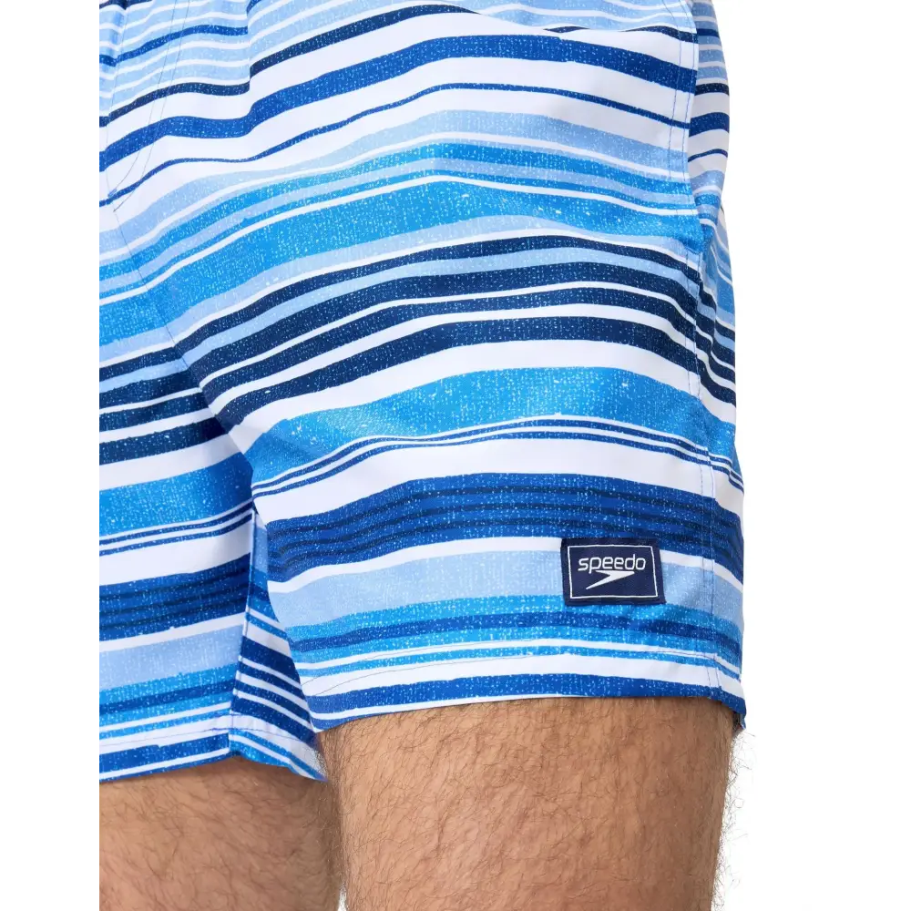 The Printed Leisure 16" Watershorts by Speedo hit the pool or beach in style, featuring faded blue and white striped bands for a relaxed, summery vibe. Made from soft brushed-finish fabric with side-pocket drainage, these lightweight shorts offer comfort and a secure fit with an adjustable drawstring waist. Each pair is digitally printed and uniquely crafted, ensuring every swim short has its own one-of-a-kind design.