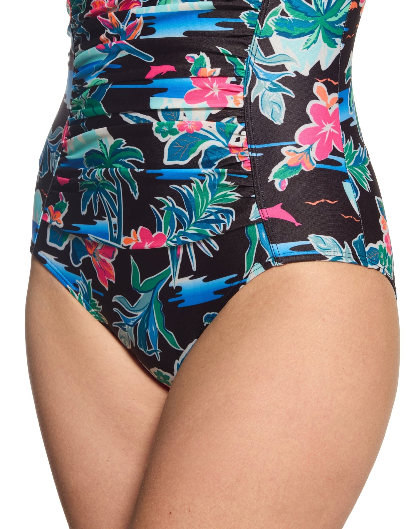 The Retro Surf Ruched Bandeau Swimsuit from Zoggs features a flattering ruched front in a beautiful multi-coloured pattern of bright tropical flowers on a background of black. Perfect for swimming or sunbathing, it features supportive foam cups, a low leg height, front lining and flattering ruching on the front panel. It also has useful, adjustable, removable thin straps for a perfect tan, you can also wear them straight or crossed at the back for extra support.