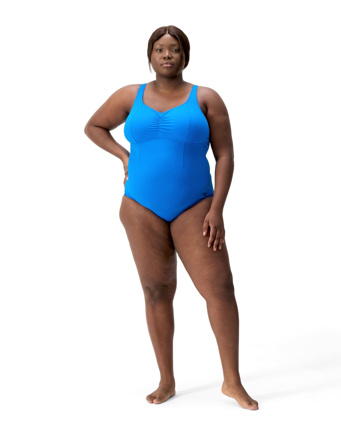 The Shaping AquaNite swimsuit from Speedo shapes and flatters your figure in a bright blue with a flattering soft ruched, V-neckline design. Offering medium bust support, the hidden bust shelf liner and adjustable straps ensure a great fit during your swim, while the all-over shaping fabric provides support where you need it. Made from 100% pre-consumer waste fabric, ECO SHAPE COMPREX ULTRA fabric includes LYCRA® XTRA LIFE™, which is ultra-chlorine resistant and lasts twice as long as standard swimwear fabrics.