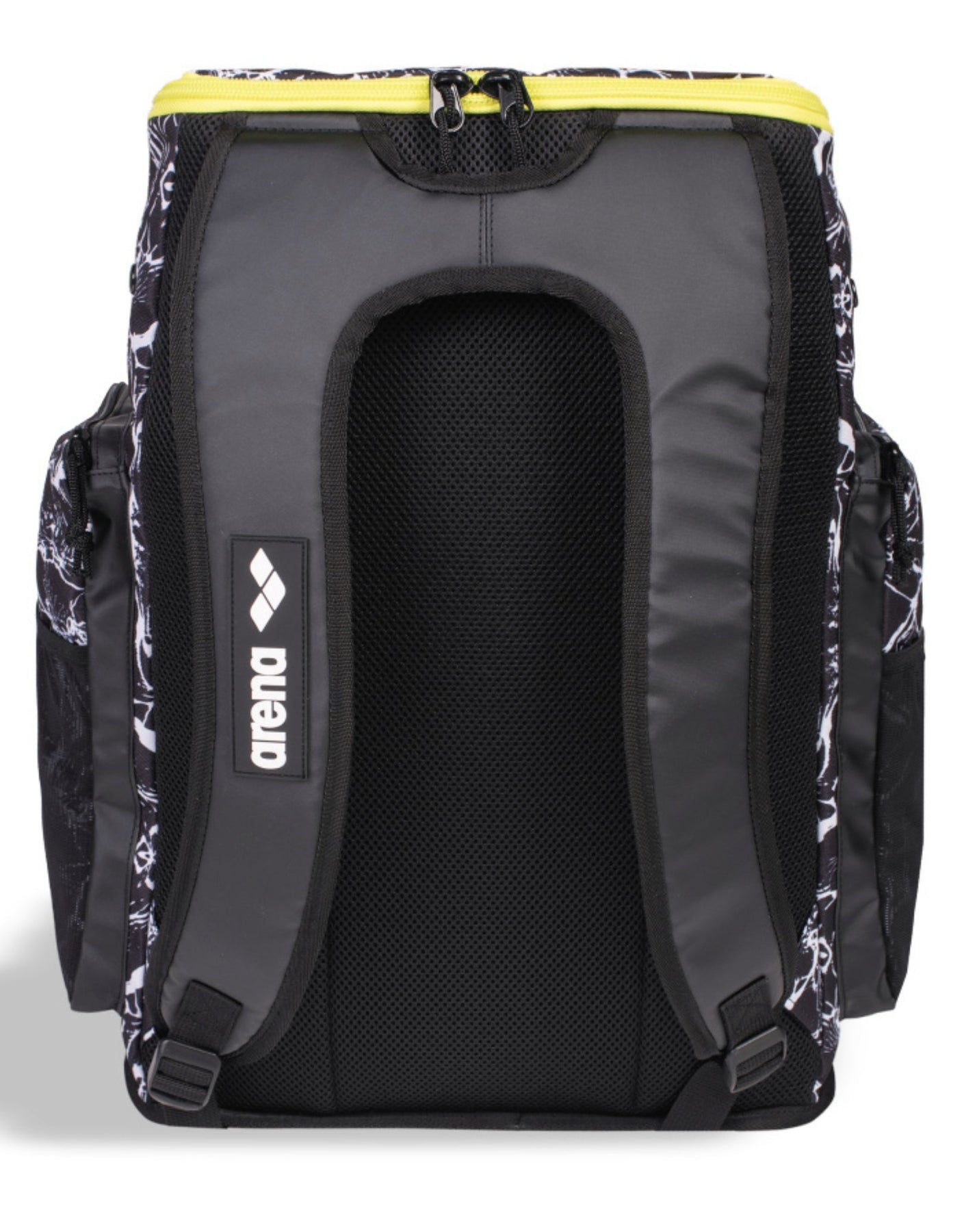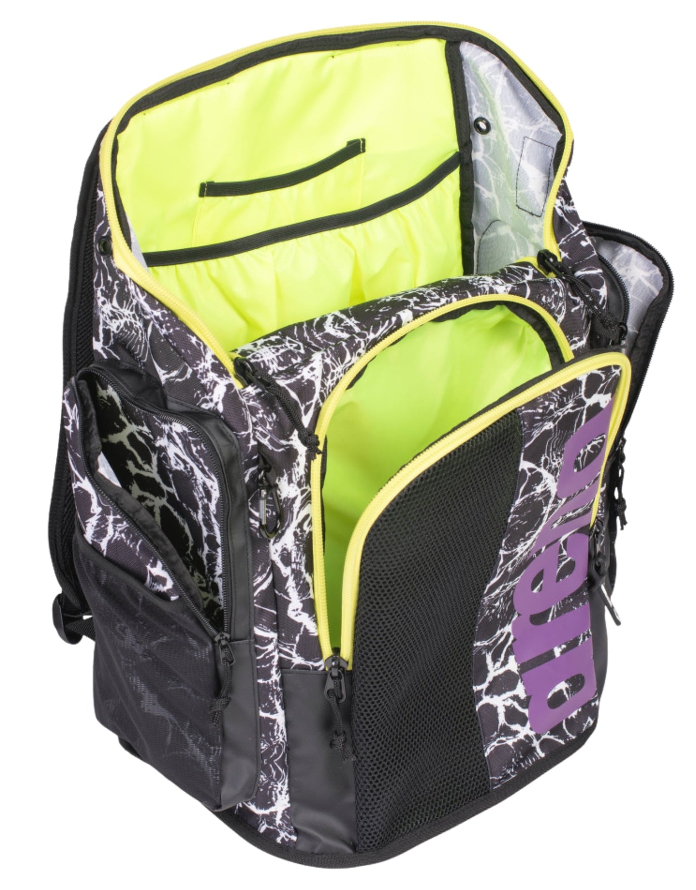 The Arena Spiky III Allover Team Backpack in Black and White is a stylish, comfortable, and roomy backpack featuring a black and white pattern of graphic marbling. It has black straps and details with zips and inner pocket lining of lime. Offering 45L capacity with several compartments for easily transporting sports gear and wet swimwear, this makes this a perfect bag for regular swimming sessions. This backpack has a reinforced bottom, padded and breathable pack panel, comfortable straps, and water-repellent fabric making it ideal for swim training, competition, and other sports activities.