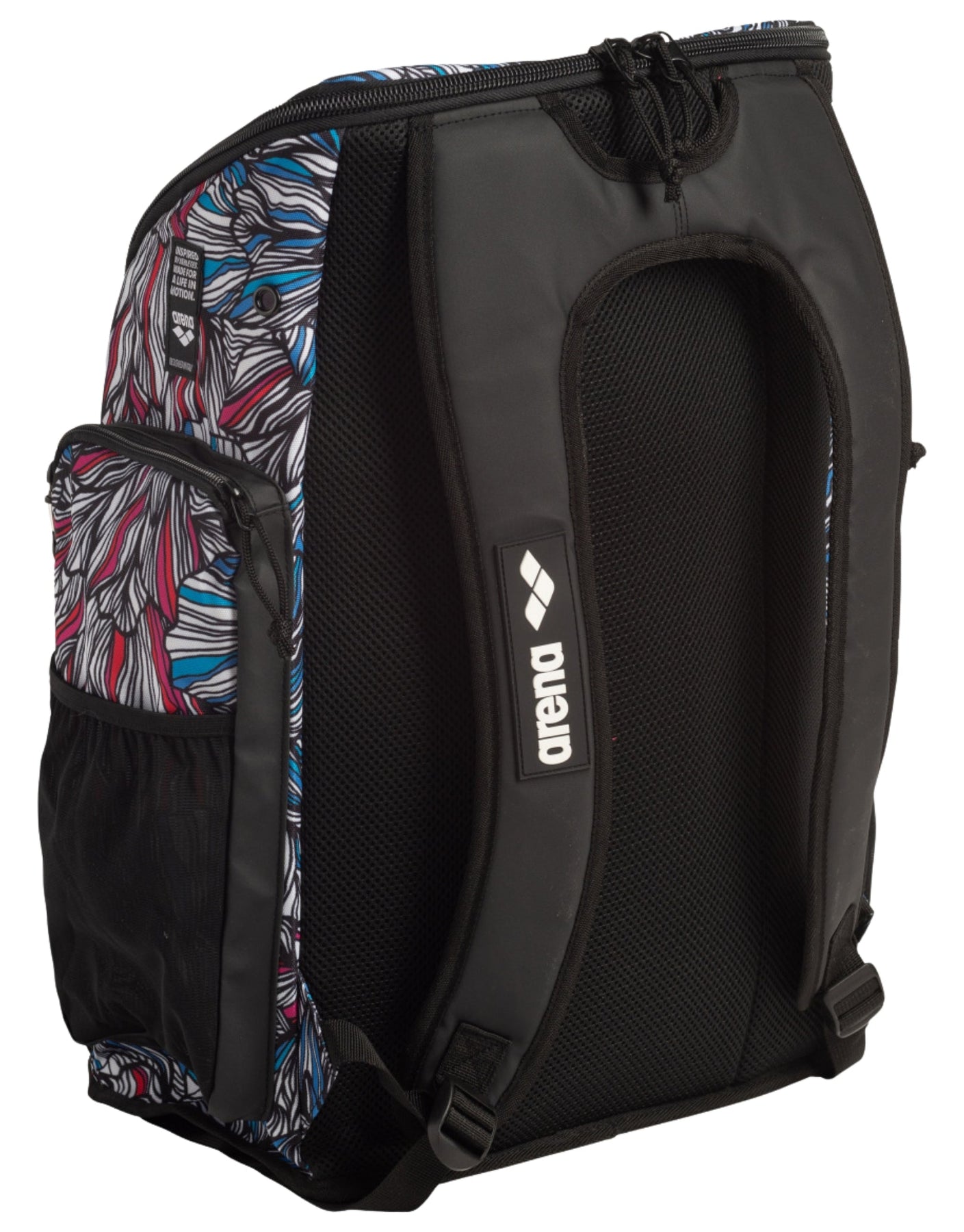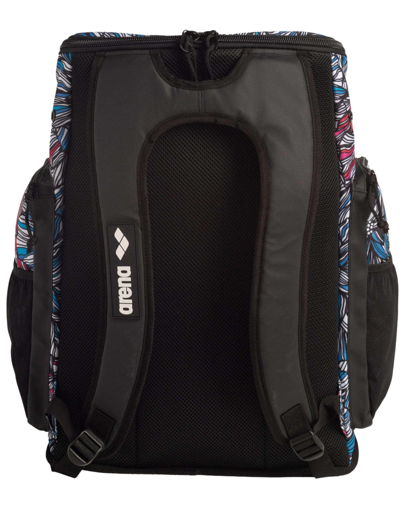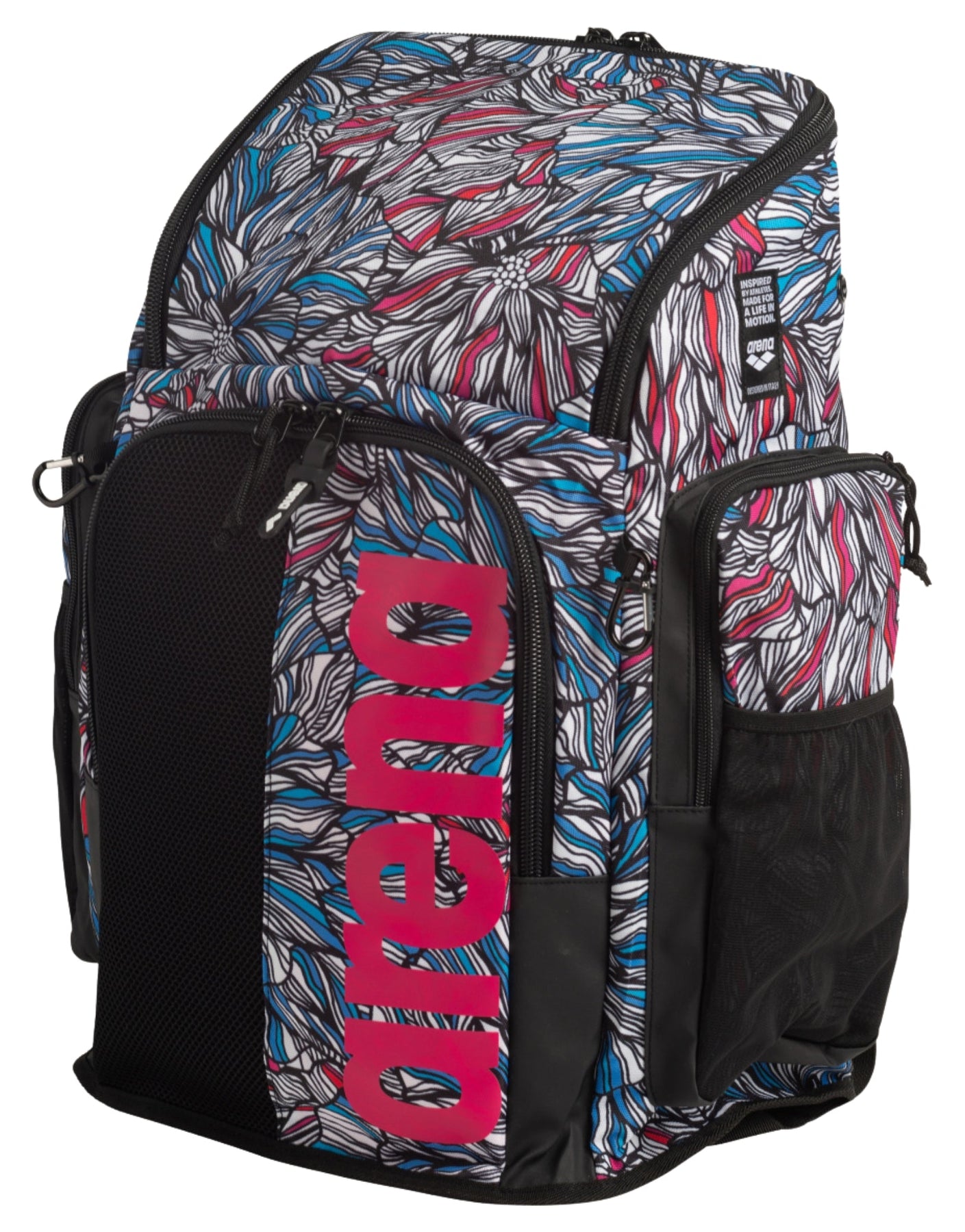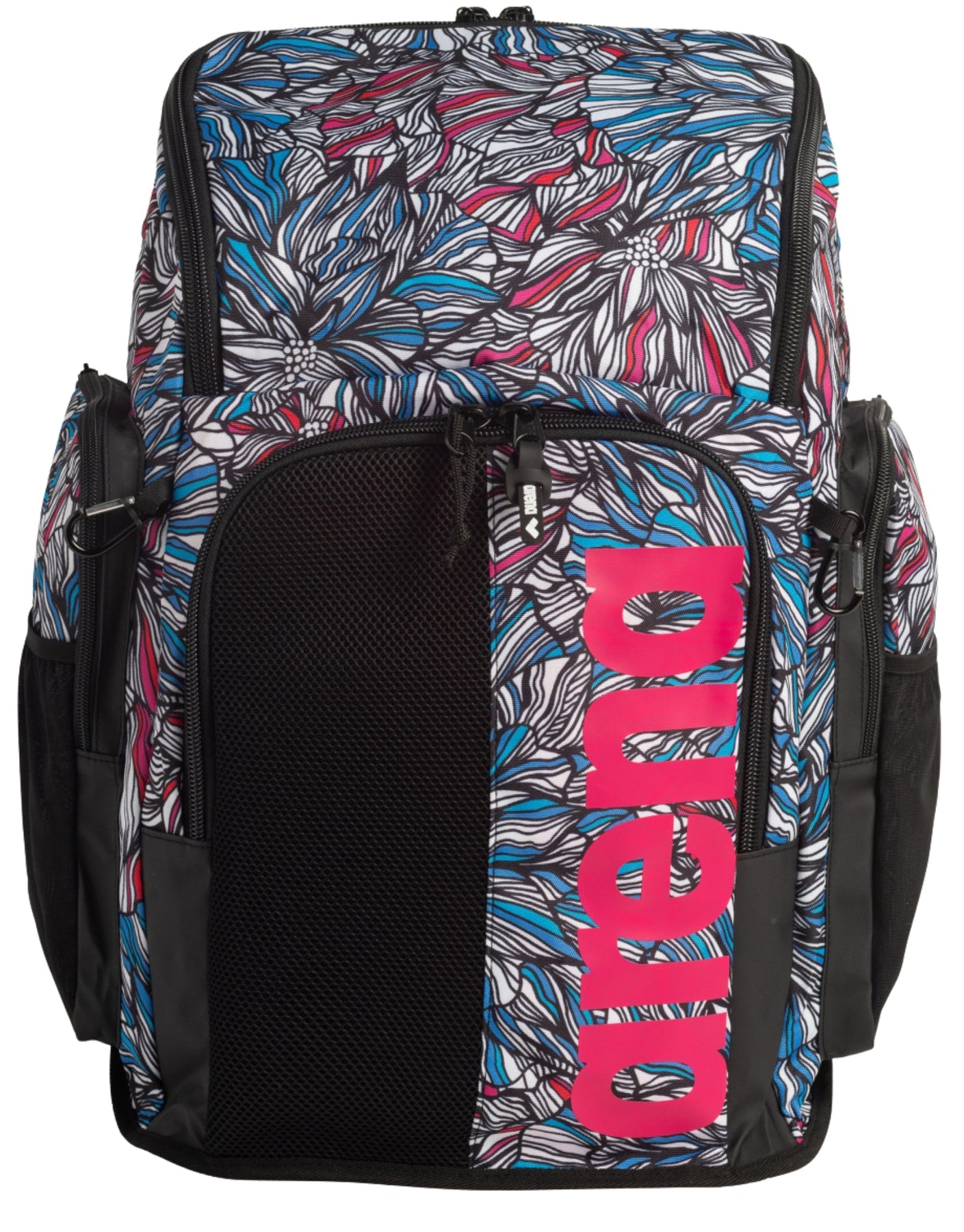 The Arena Spiky III Dahlia Allover Team Backpack is a stylish, comfortable, and roomy backpack featuring a stunning pattern of dahlia flowers in blue and magenta with black detailing, straps and padded back in black. Offering a 45L capacity - with several compartments for easily transporting sports gear and wet swimwear, making it perfect for regular swimming sessions. This backpack has a reinforced bottom, padded and breathable pack panel, comfortable straps, and water-repellent fabric, ideal for swim training, competition, and other sports activities.