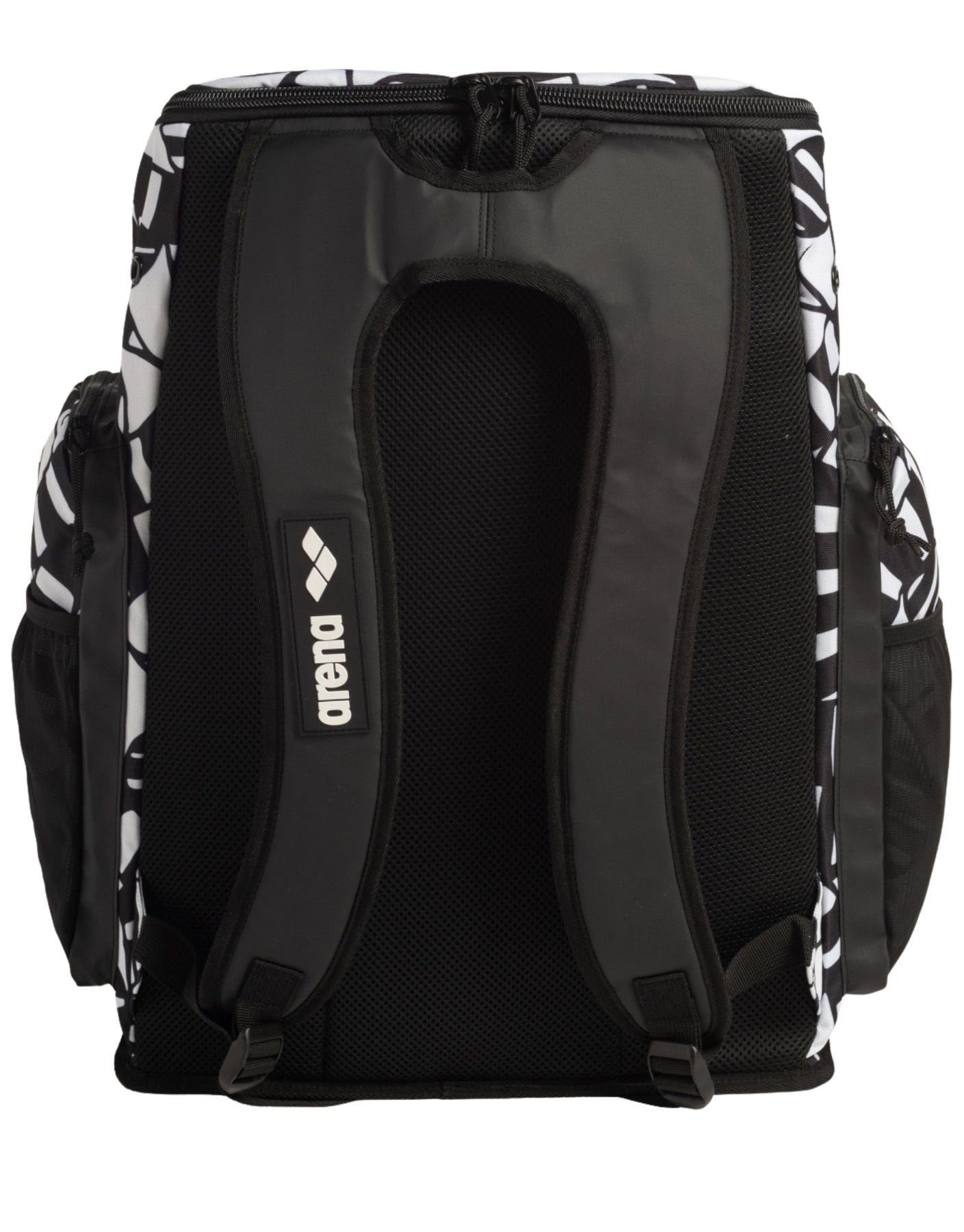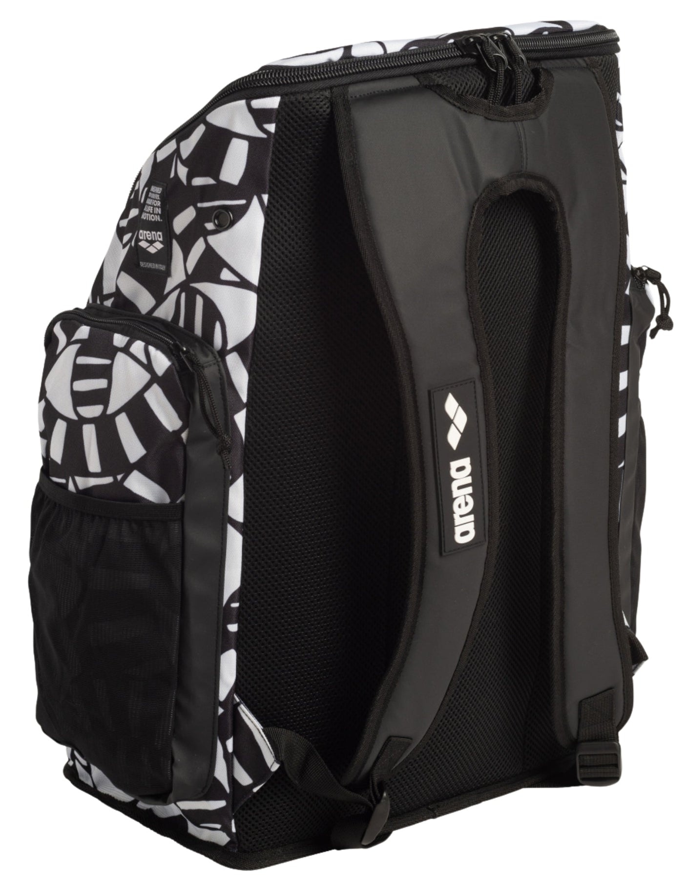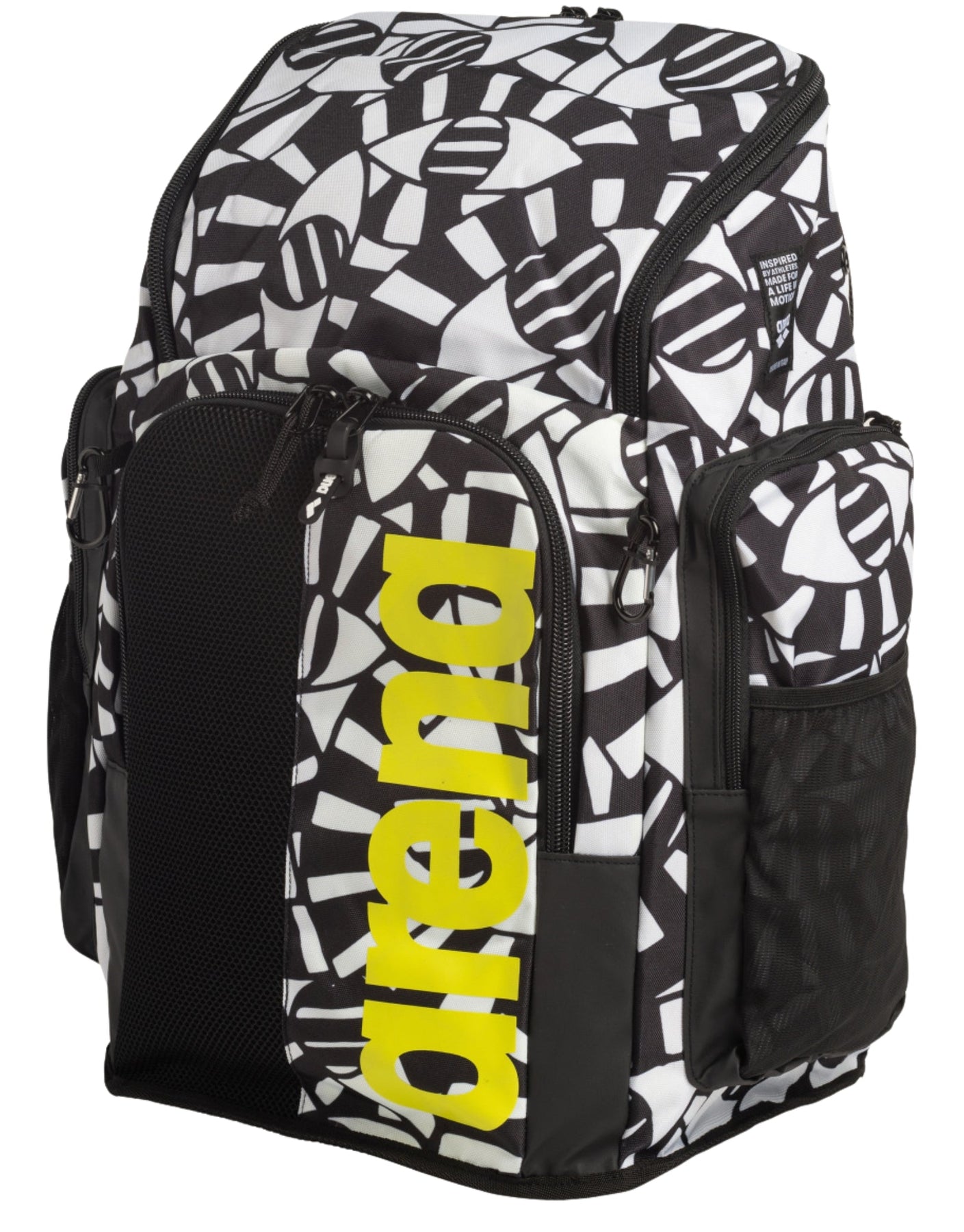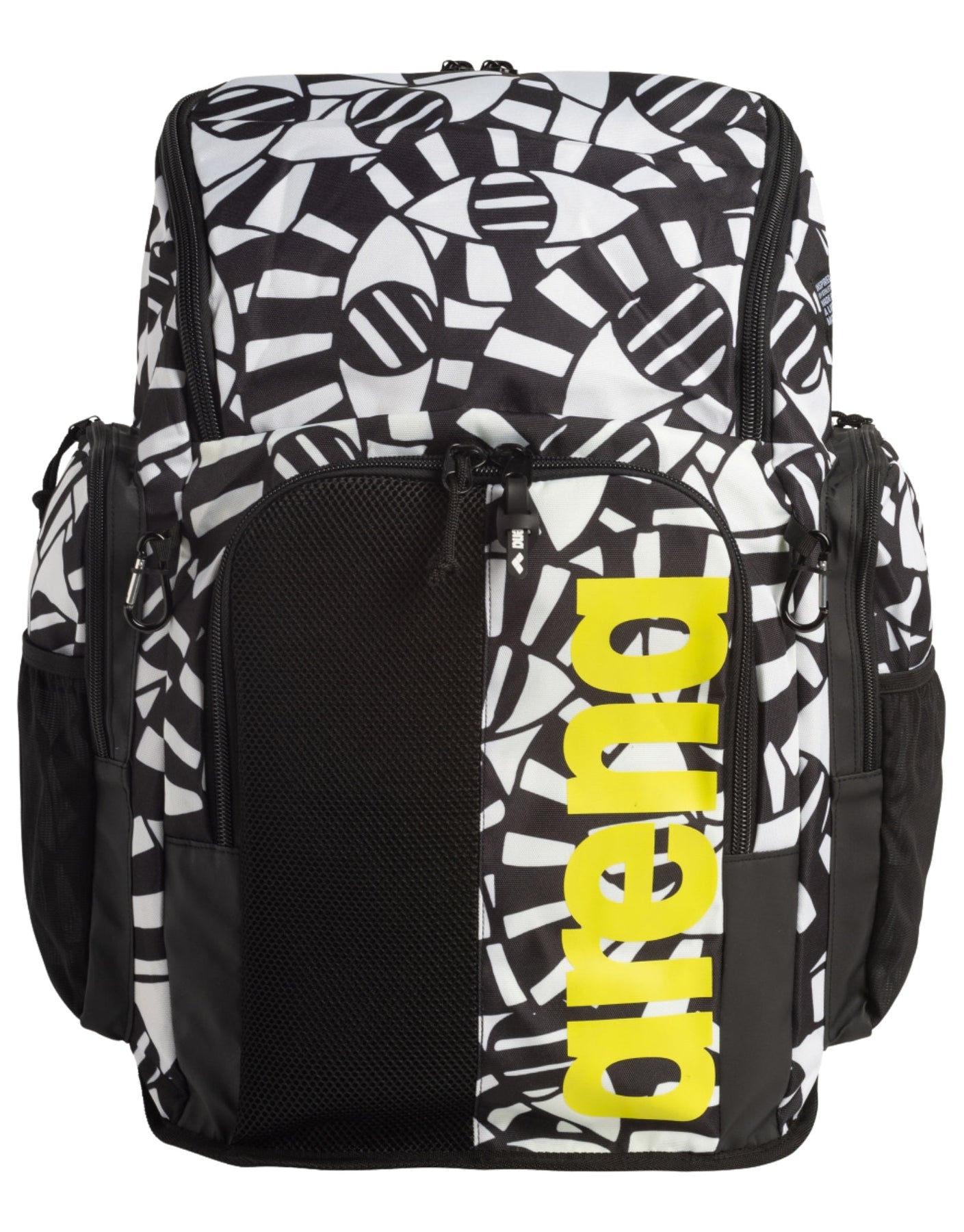 The Arena Spiky III Open Your Eyes Allover Team Backpack is a stylish, comfortable, and roomy backpack featuring a black and white pattern of graphic eyes with black straps and details. Offering a 45L capacity - with several compartments for easily transporting sports gear and wet swimwear, makes this a perfect bag for regular swimming sessions. This backpack has a reinforced bottom, padded and breathable pack panel, comfortable straps, and water-repellent fabric making it ideal for swim training, competition, and other sports activities.
