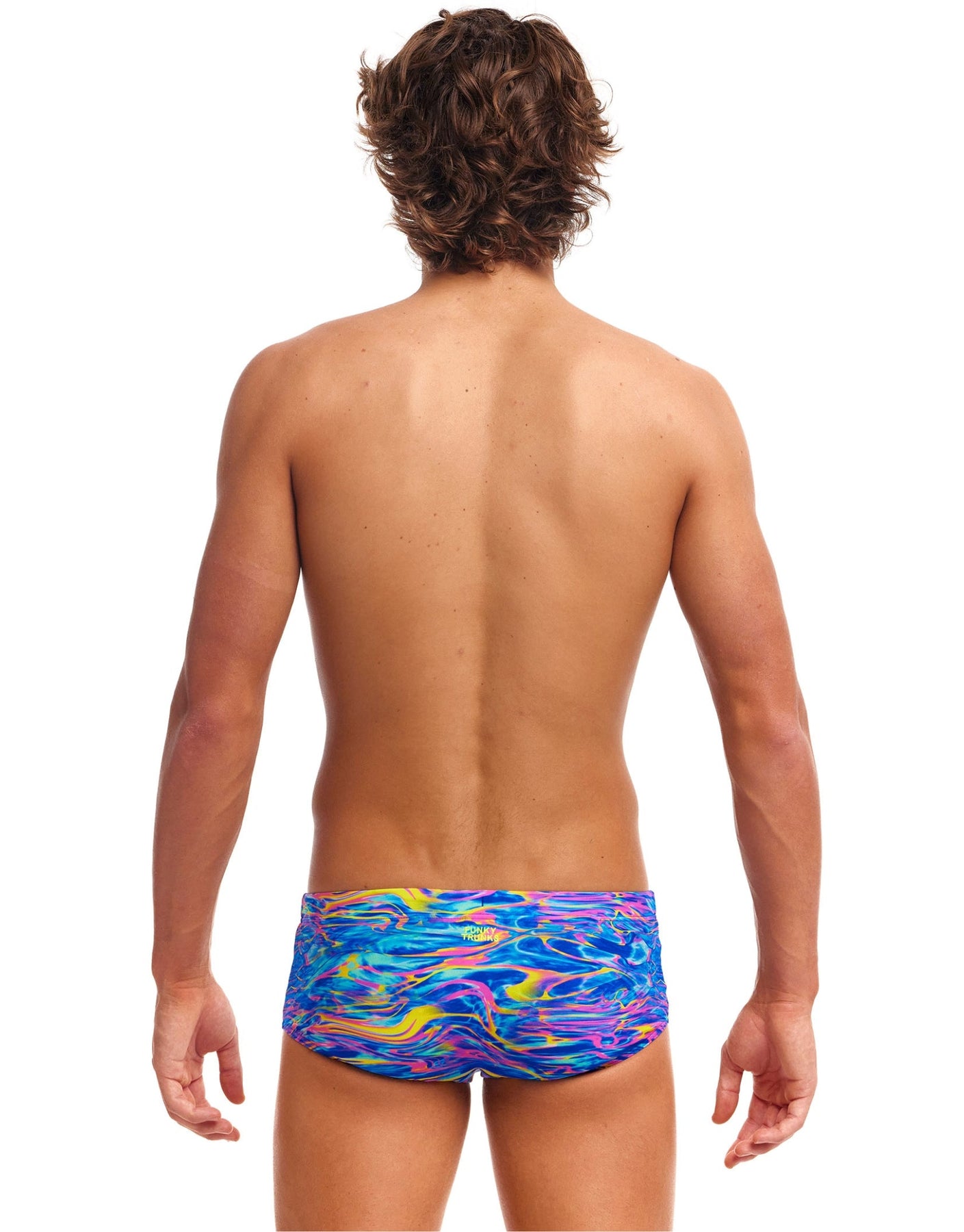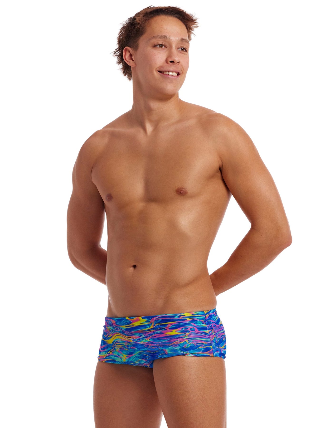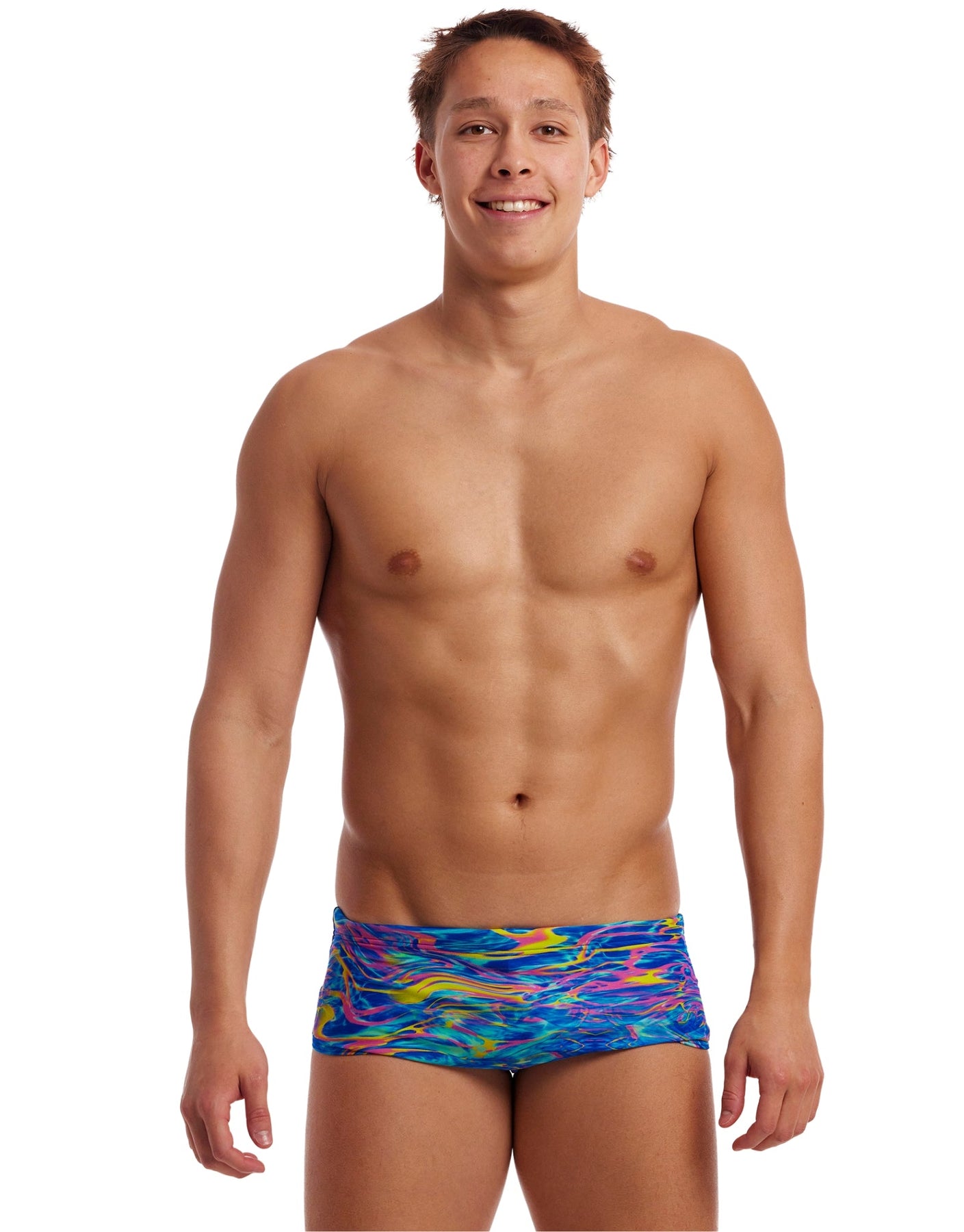 The Stir Crazy Sidewinder Swim Trunks from Funky Trunks for men are chlorine-resistant, durable and made from sophisticated ECO C-Infinity fabric. Featuring a swirling pattern of pinks and yellows on a background of blues, they will make you stand out from the crowd. With a wide elastic leg opening and waistband for comfort and a drawcord for a secure and comfortable fit. Ideal for recreational or performance-based swimming.
