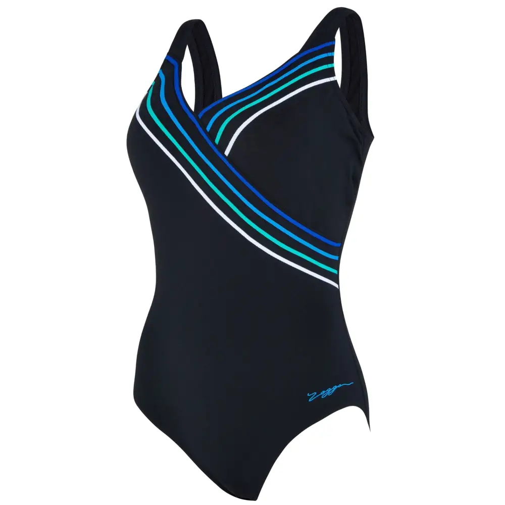 This stunning navy swimsuit from Zoggs features flattering diagonal stripes, and a high scoopback with the addition of underwiring and wide straps for maximum support in the pool. This swimsuit is chlorine resistant ensuring a long-lasting fit, and to stay safe in the sun, offers UPF50+ sun protection.